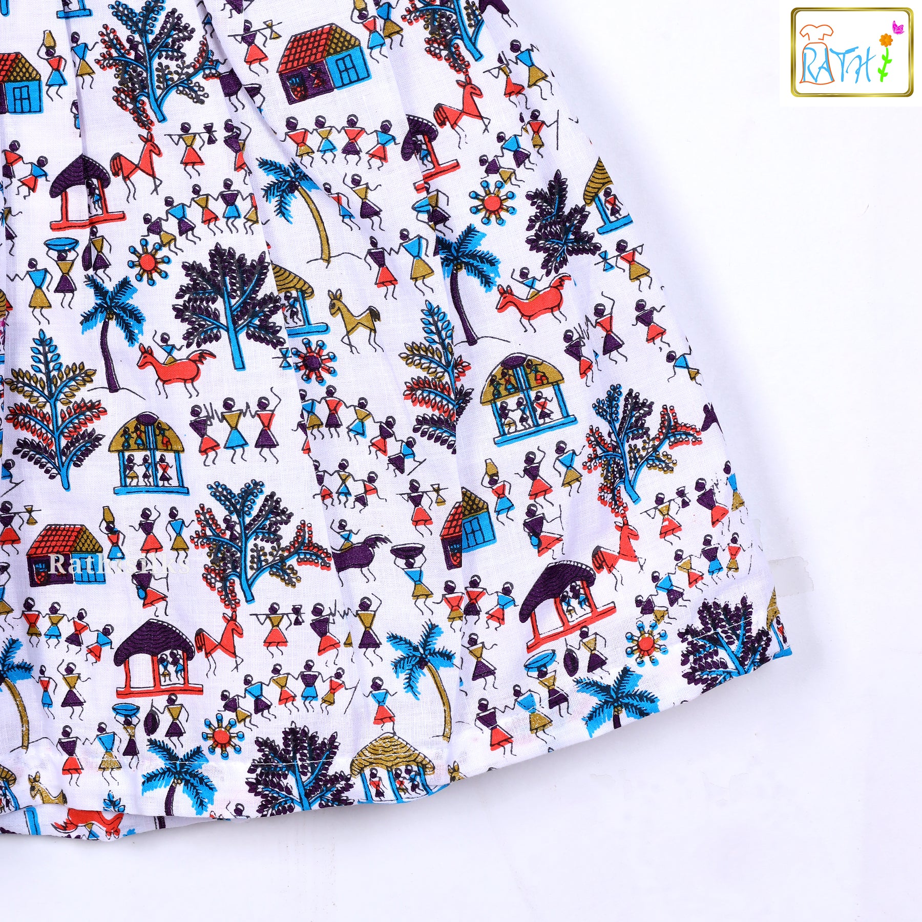 This delightful Village-Themed Mangalagiri Cotton Frock brings together colourful hand-printed artistry and a cute modern style. Designed with a charming village print pattern all over, this frock showcases trees, huts, figures, and scenic motifs that make it visually attractive and unique.