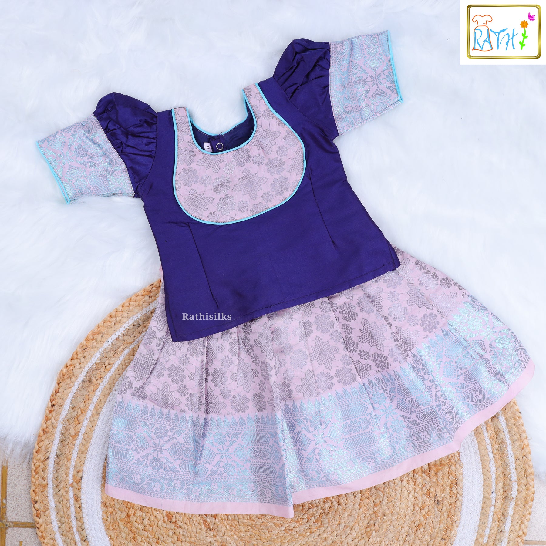 Celebrate heritage and grace with this charming Pavadai Sattai set, thoughtfully crafted to make your little one shine during festive occasions. The rich purple blouse features a unique bib-style panel in delicate pastel pink zari weave, accentuated by contrast piping and elegant short puff sleeves adorned with matching woven borders. The coordinating pleated skirt showcases an all-over pastel pink base interwoven with shimmering silver zari motifs and a broad floral zari border that exudes sophistication. Lightweight, breathable, and lined in soft cotton, this ensemble is the perfect blend of traditional South Indian artistry and contemporary styling—ideal for weddings, festivals, and temple visits.