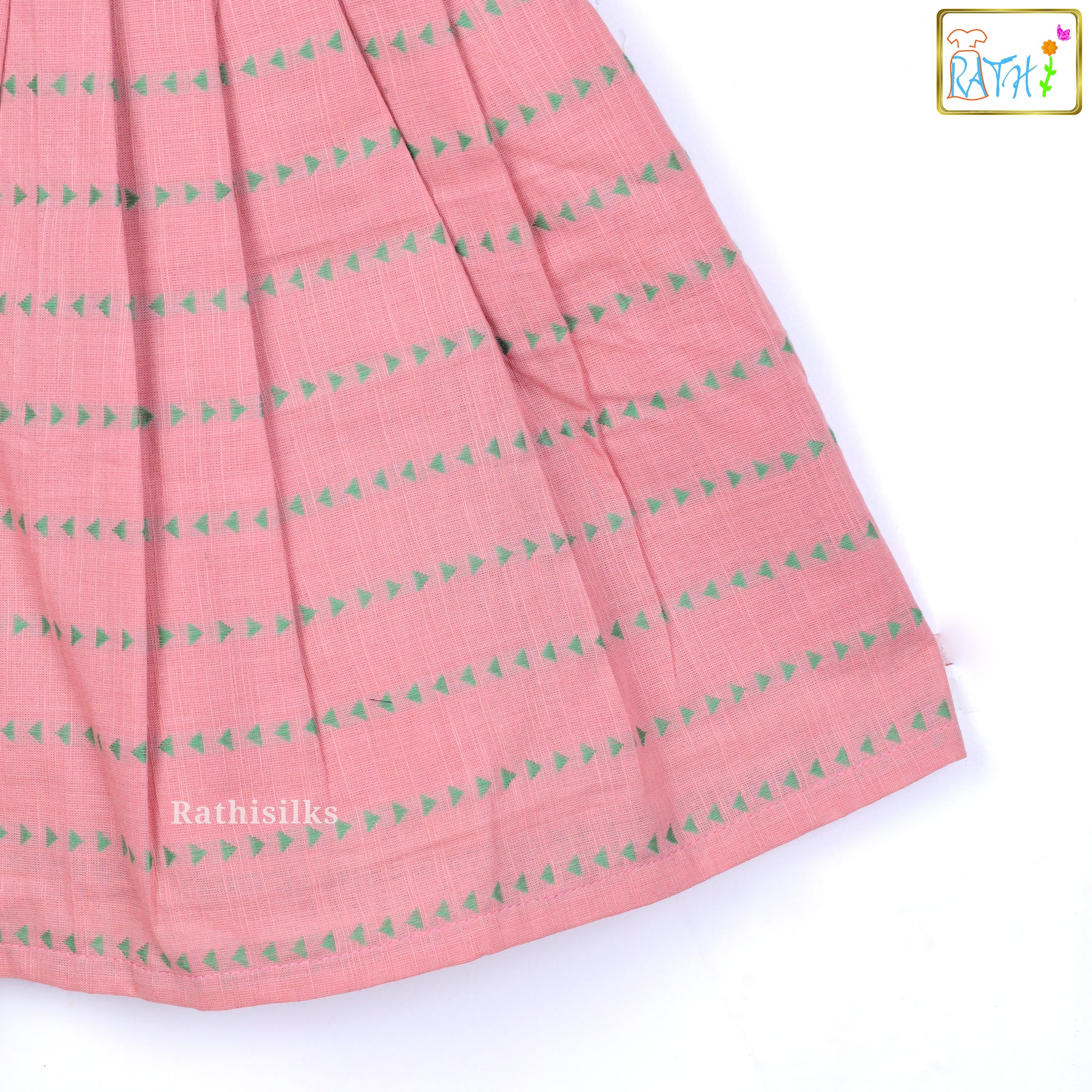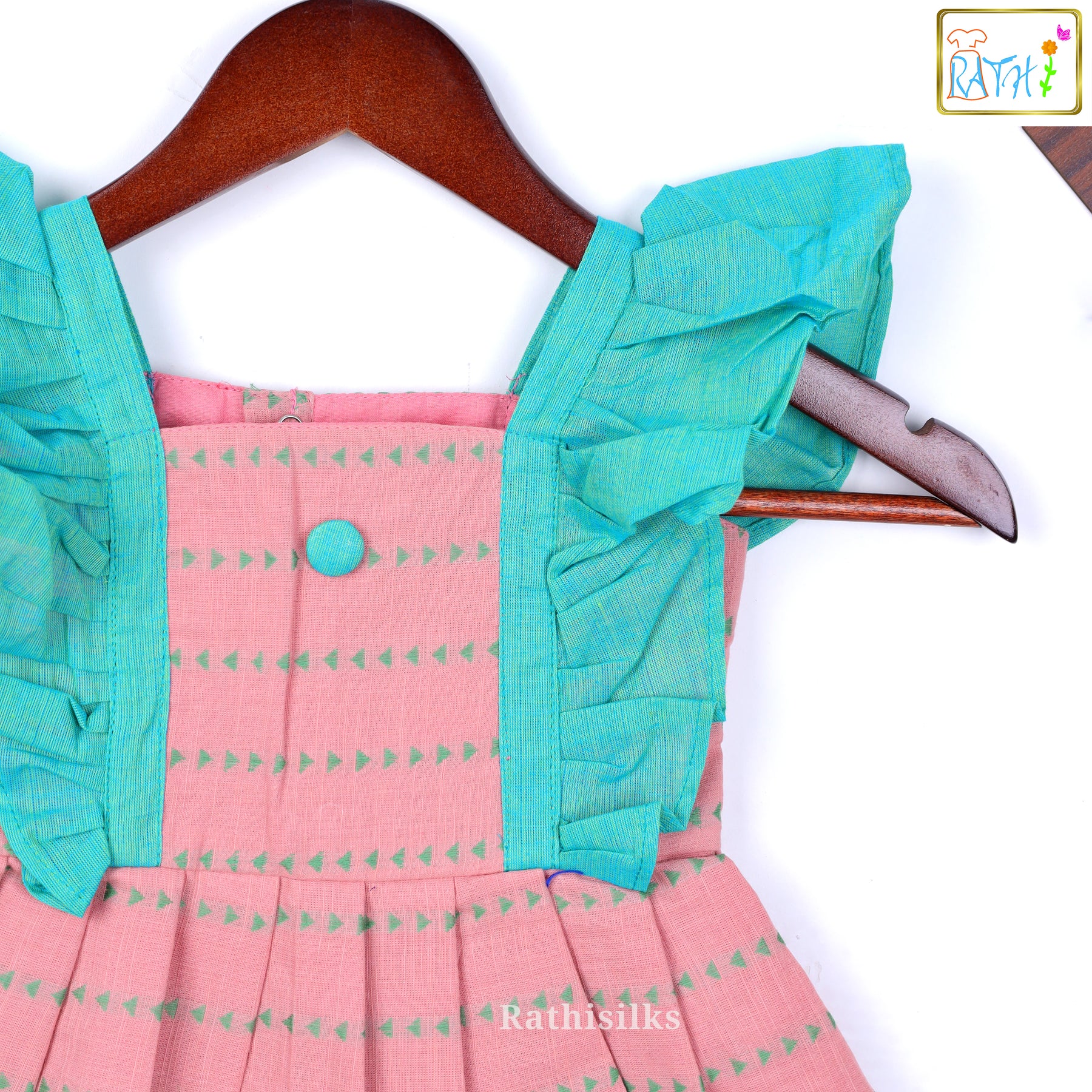 This adorable frock offers a contemporary, playful take on ethnic wear. The main body of the dress is a soft dusty or pastel pink fabric, featuring subtle horizontal lines of small teal arrow or triangle motifs. The skirt is gathered with neat pleats, giving it a soft, full shape. The contrasting aqua/teal fabric forms charming, voluminous ruffle cap sleeves that frame the shoulders and bodice. The bodice itself is simple, featuring a single contrasting button detail on the chest. This comfortable, light-weight dress is perfect for casual parties, playdates, and everyday ethnic or fusion wear.