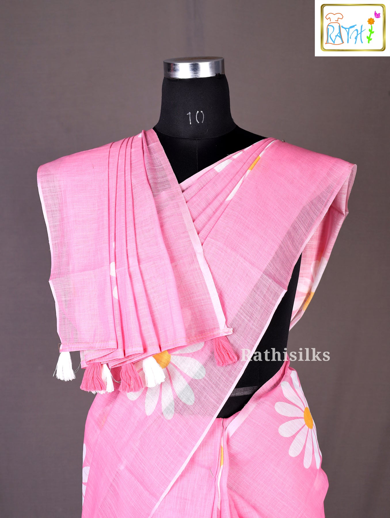 Soft Pink Linen Cotton Saree with White Daisy Floral Prints & Lightweight Finish