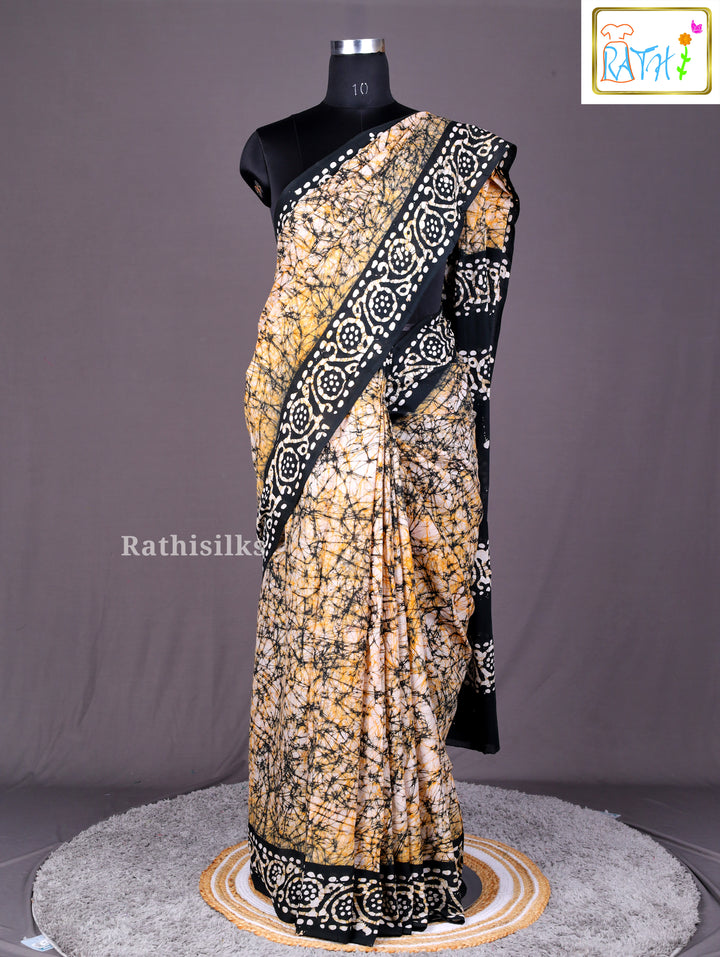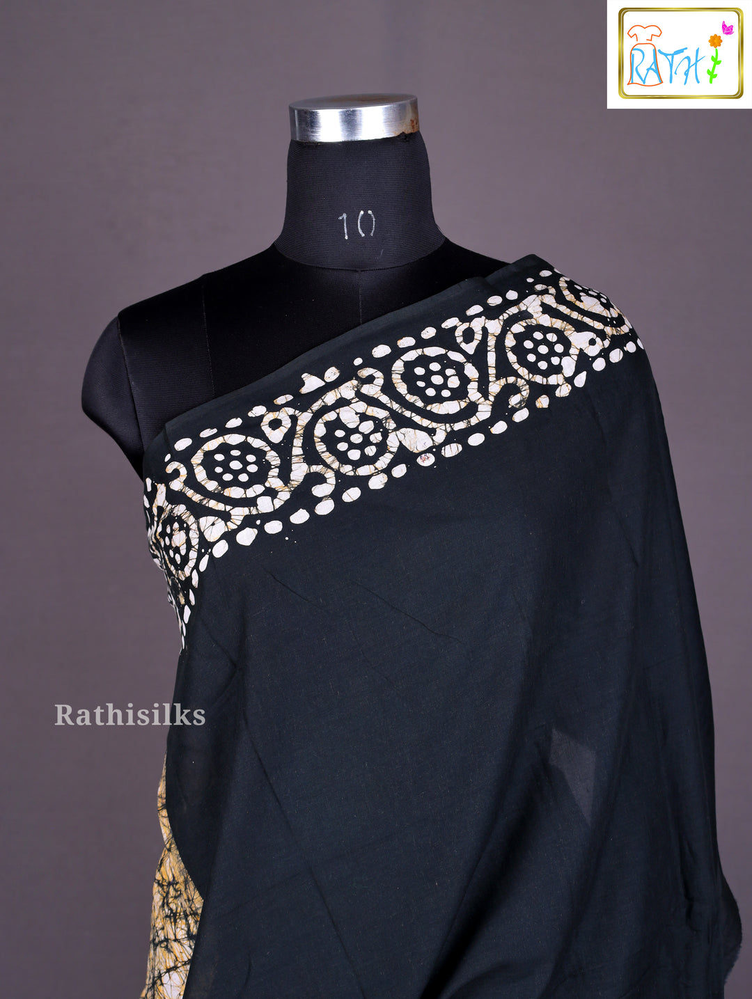 Elevate your ethnic wardrobe with this striking Batik-print cotton saree, showcasing a beautiful fusion of traditional artistry and modern style. Crafted from soft and breathable cotton, this saree features a classic black and golden-yellow color palette. The body of the saree has an intricate, crackle-effect batik pattern in golden tones, while the broad black border and pallu are adorned with bold, circular and floral motifs. Perfect for a variety of occasions, this unique saree offers both comfort and a distinct, artistic appeal.