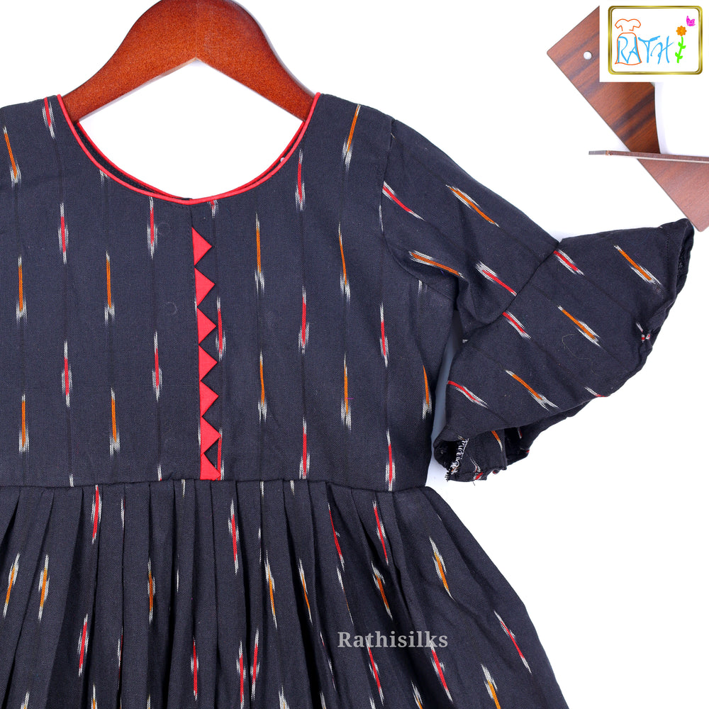 This elegant long frock is a striking piece featuring a classic Ikat (tie-dye) pattern on a dark base. The entire dress is a deep Black/Dark Grey with the characteristic feathered Ikat motifs woven in vibrant threads of Red, Orange, and White/Gold. The bodice has a simple, gathered design, accented by a central vertical strip of triangular Red trim. The neckline is also finished with a thin Red piping. A distinctive feature of this frock is the three-quarter length sleeves, which finish with a stylish double-layered ruffle/flounce. The long, pleated skirt provides a graceful drape, making it suitable for both festive and semi-formal events.