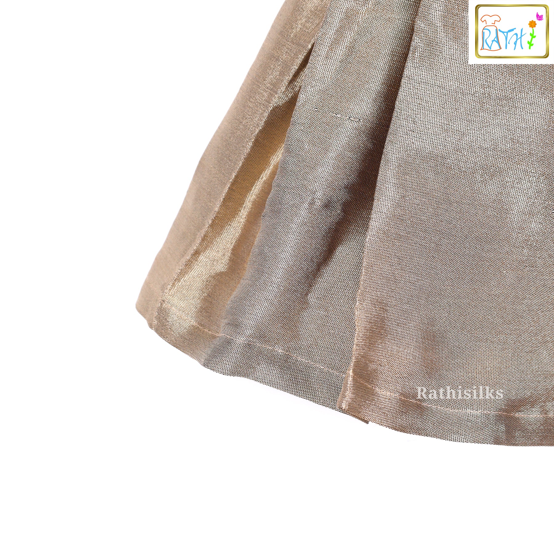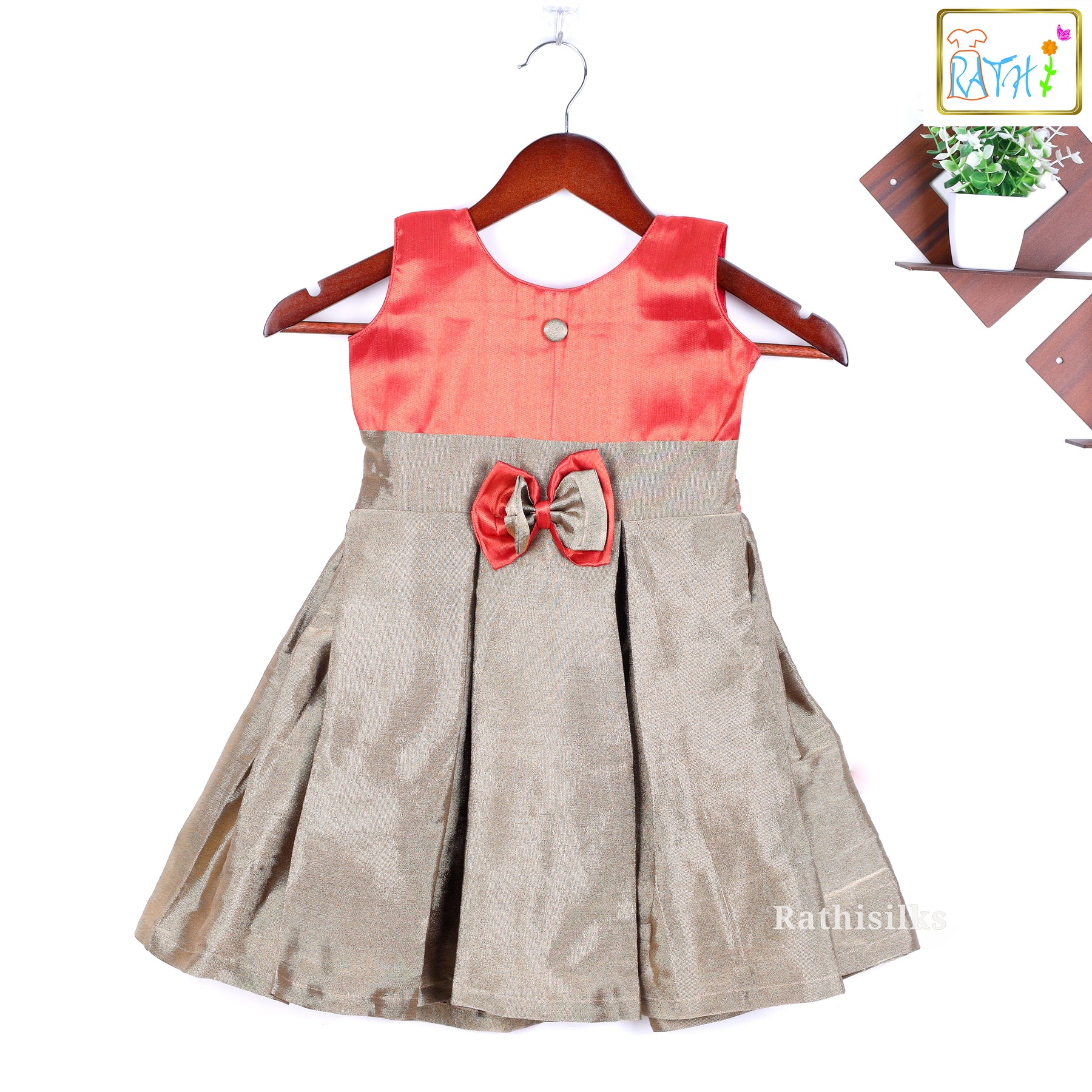 This charming frock is a perfect blend of elegance and tradition, designed for little girls to shine at special occasions. The upper bodice features a rich red fabric with a button accent, while the lower part is crafted in shimmering gold with intricate woven patterns. A matching bow at the waistline enhances the overall grace, giving the dress a festive and royal look. The flared skirt with neat pleats adds volume, making it both stylish and comfortable for celebrations. Ideal for weddings, parties, and festive gatherings, this dress is a delightful choice for your little princess.