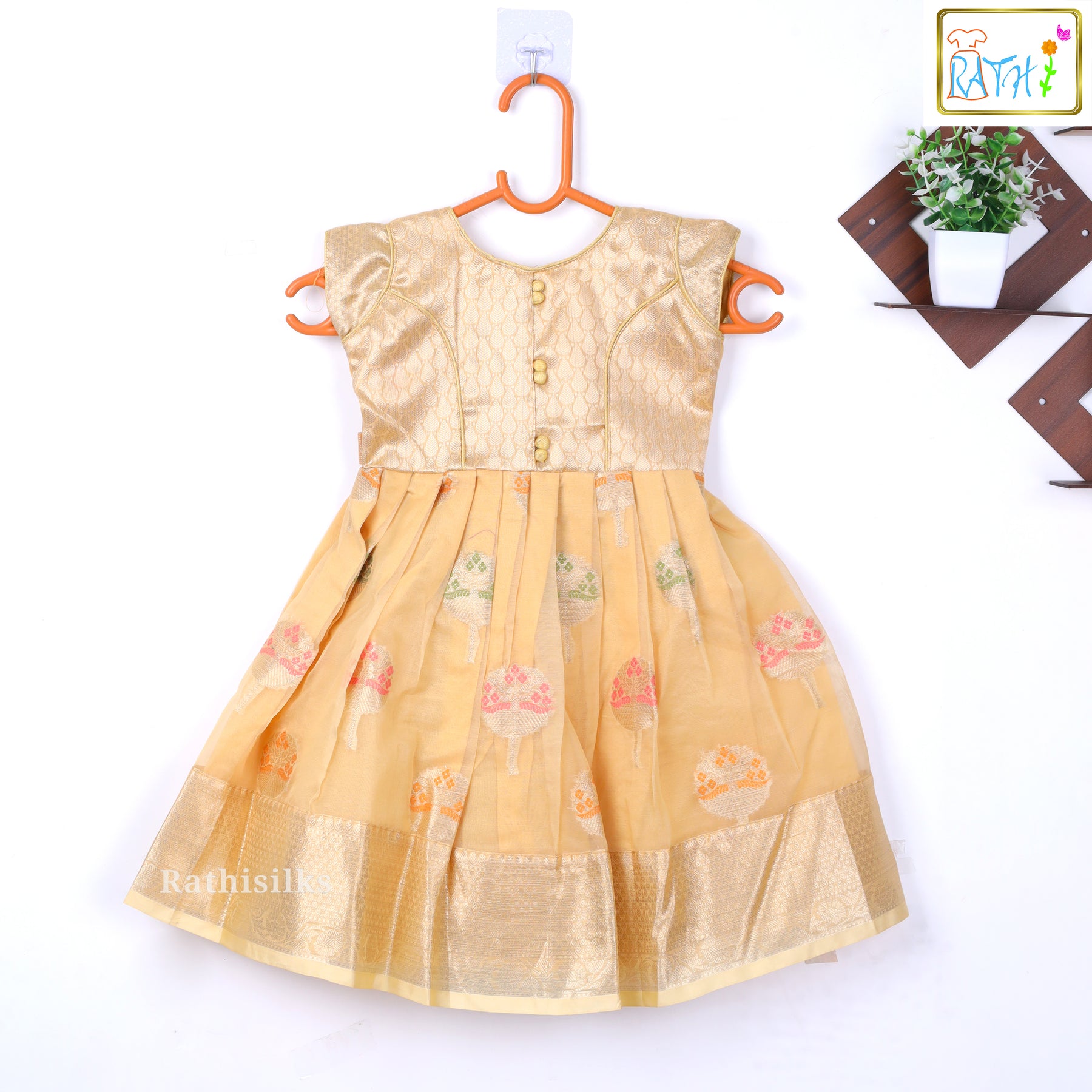 Elegant Golden Frock with Colorful Floral Embroidery for Girls
