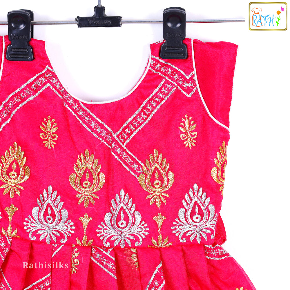 This striking frock is a vibrant and luxurious piece of ethnic wear, featuring a beautiful blend of color and metallic weaving. The entire frock, including the sleeveless bodice and the full, pleated skirt, is made from a bright Hot Pink/Magenta Art Silk fabric. The fabric is richly woven with an all-over pattern of traditional paisley or teardrop-shaped motifs (buttas), alternating in shimmering Silver and Gold thread. The bodice is designed with an overlapping V-neck look. The hem of the skirt is finished with a wide, traditional Silver Brocade Border featuring a fine geometric or temple design.