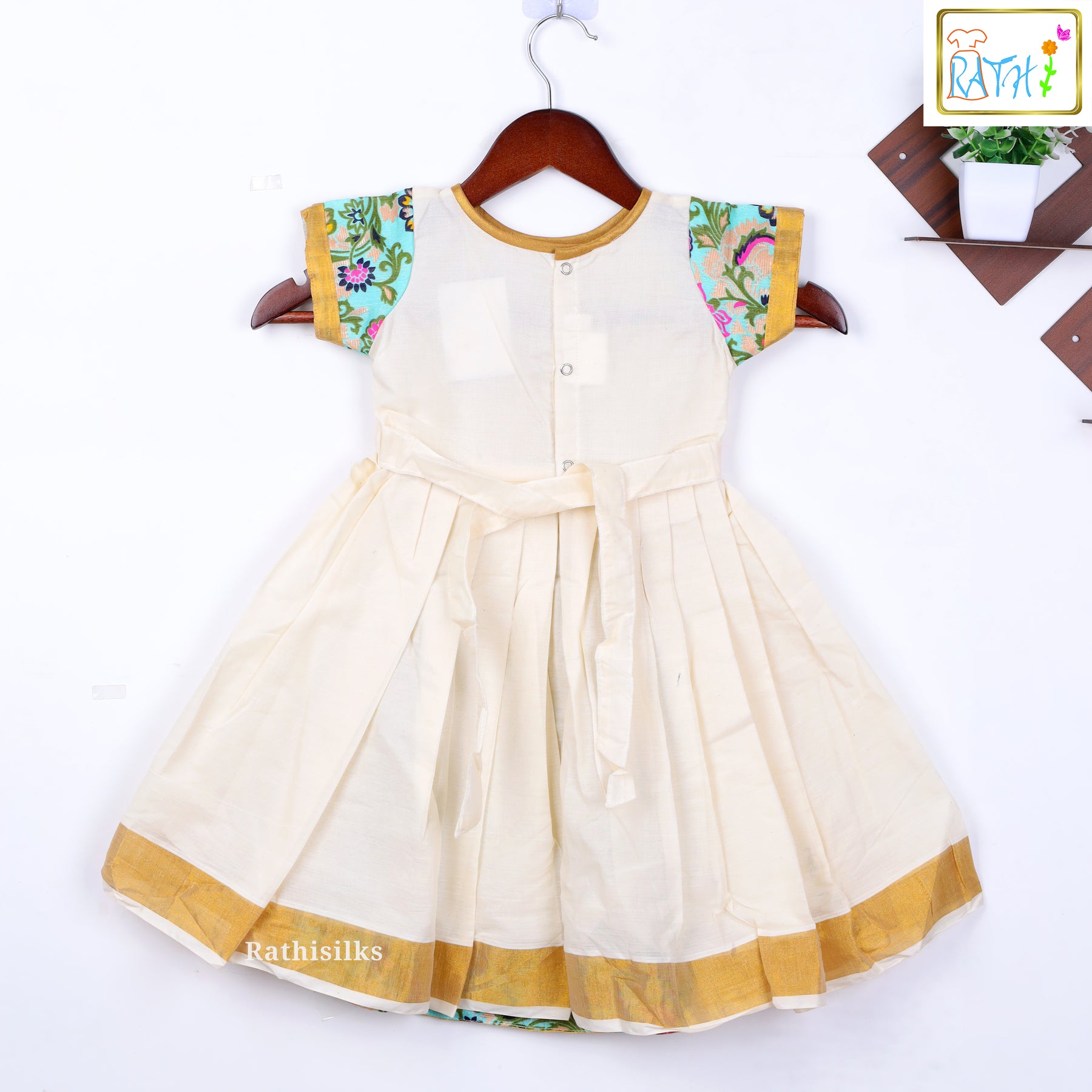 This beautiful ethnic frock is inspired by the traditional Kasavu clothing of Kerala, featuring an elegant combination of off-white/cream and gold zari border accents. The bodice and skirt are primarily the plain, handloom-style off-white fabric. The dress is given a modern twist with a prominent vertical center panel on the skirt made of a brightly colored fabric. This panel features an eye-catching floral pattern with pink, purple, and green motifs on an aqua/light blue background. Gold trim highlights the short cap sleeves and a decorative button placket on the bodice. A thick gold border finishes the skirt hem, making it a perfect, comfortable choice for Onam, Vishu, or any South Indian festive occasion.