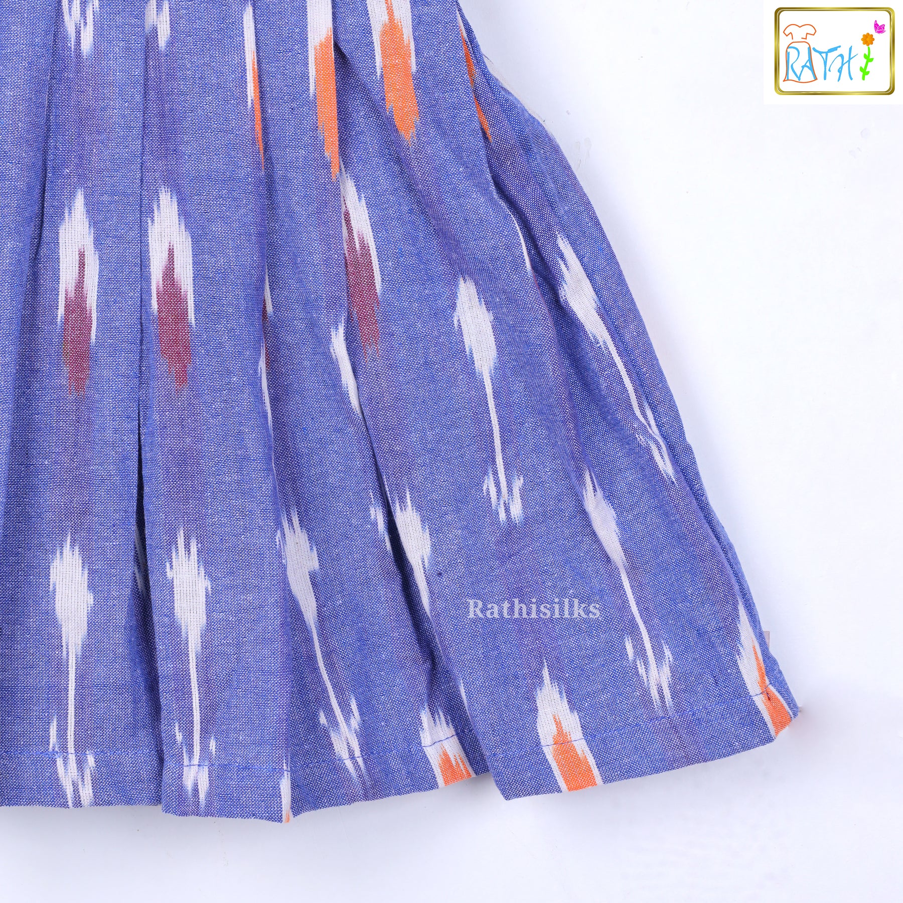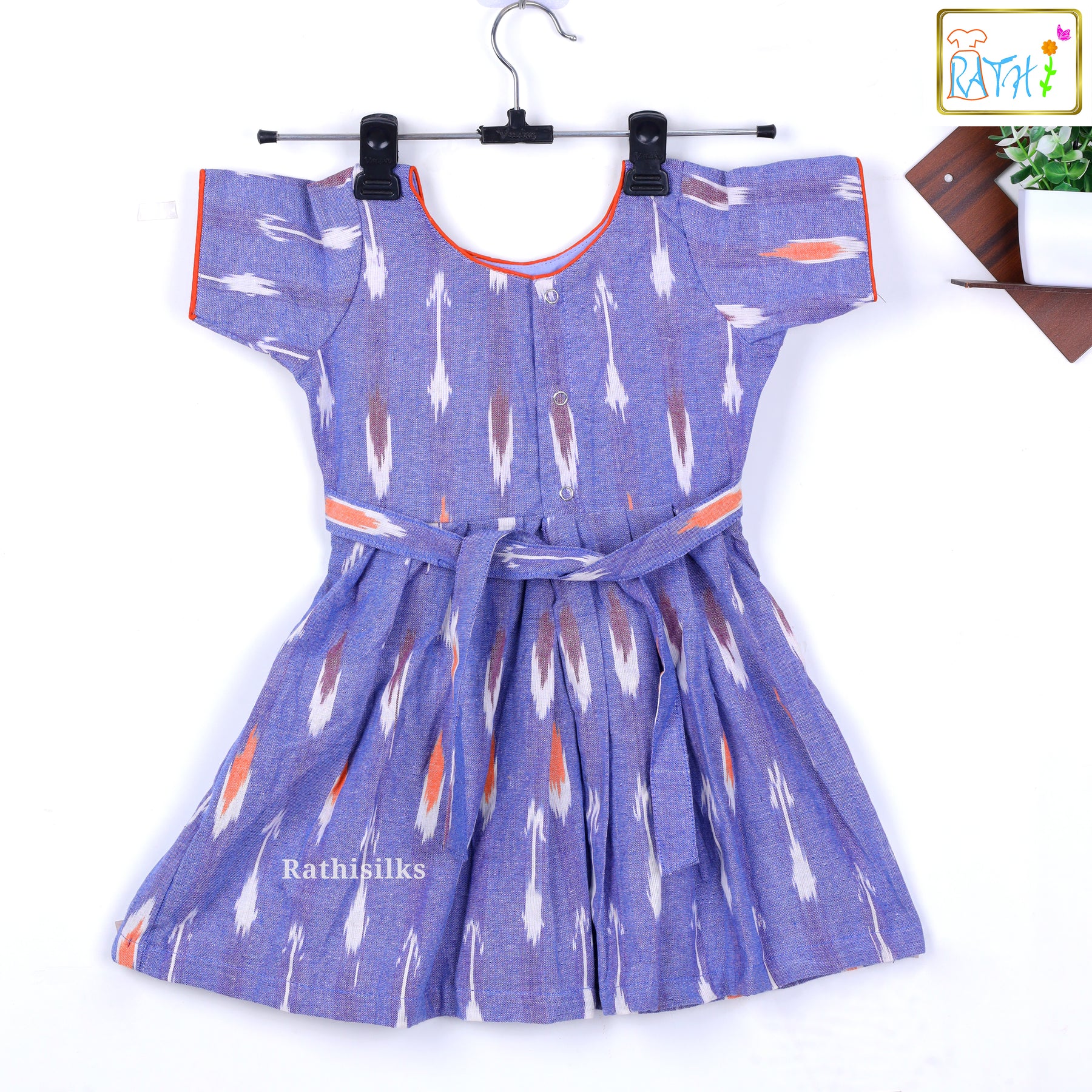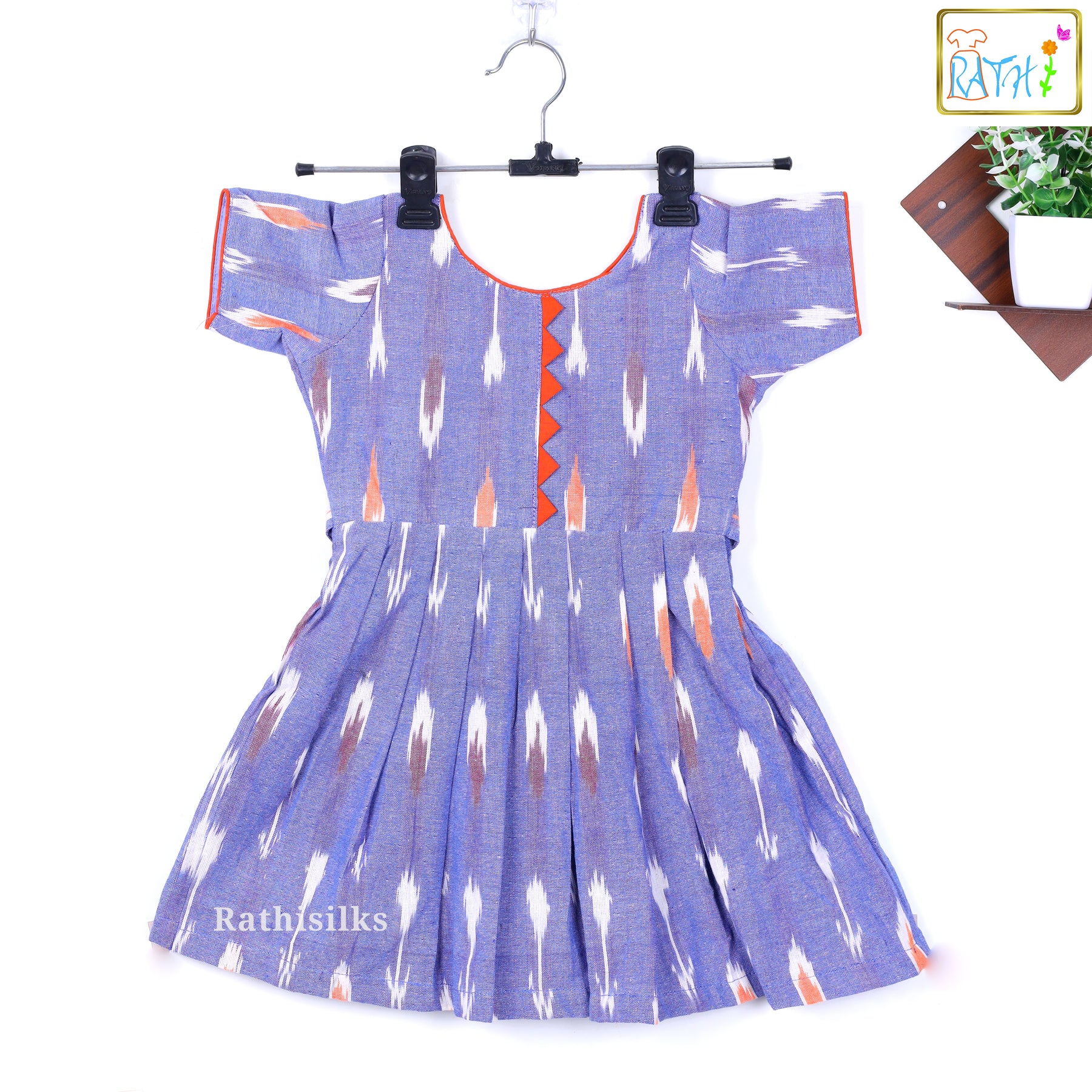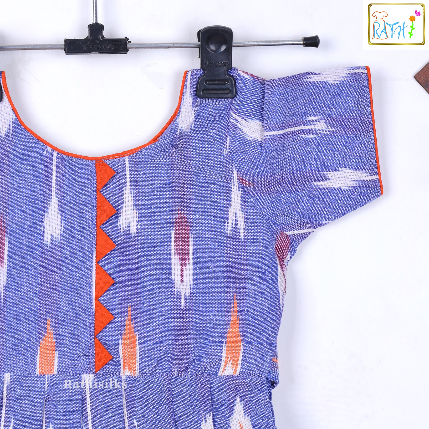 This comfortable and stylish short-sleeve frock features a lovely, soft blue-purple (lavender/periwinkle) base with a classic Ikat-style vertical print in shades of white and burnt orange/brown. The fabric is cut to form a neat, short-sleeve bodice and a fully gathered, voluminous skirt. The neck is trimmed with a bright orange piping, which is repeated down the center of the bodice in a playful, zig-zag placket detail. This simple yet charming dress, likely made from breathable cotton, is perfect for everyday wear, casual outings, and school.