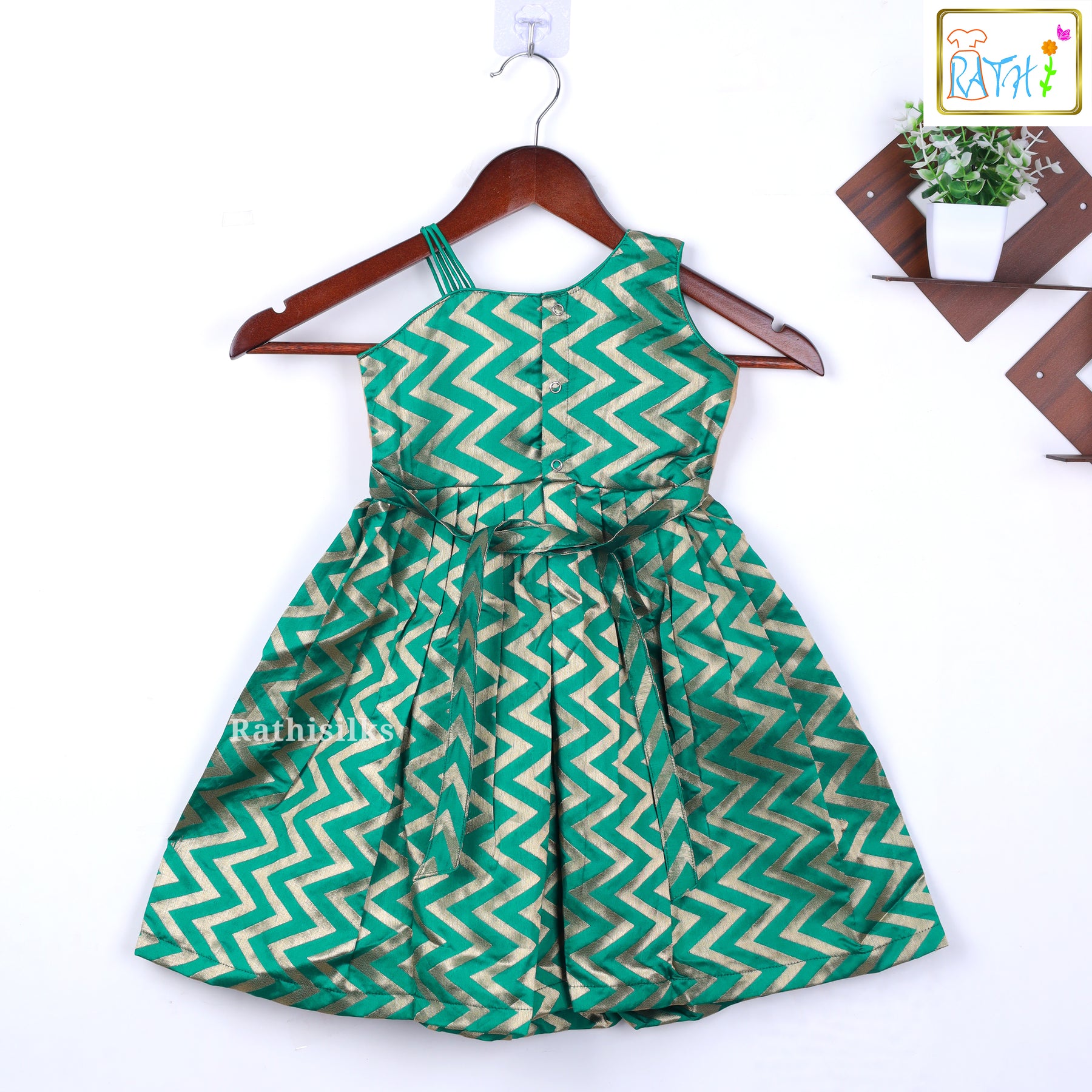 This elegant and vibrant green and gold frock is the perfect choice for any special occasion. The dress features a beautiful chevron pattern in shades of green and gold on the skirt, creating a festive and playful look. The beige bodice is adorned with a charming green flower accent with a pearl center, adding a touch of elegance. With its stylish one-shoulder design and comfortable fit, this frock is an ideal choice for birthday parties, festivals, or other joyful celebrations.