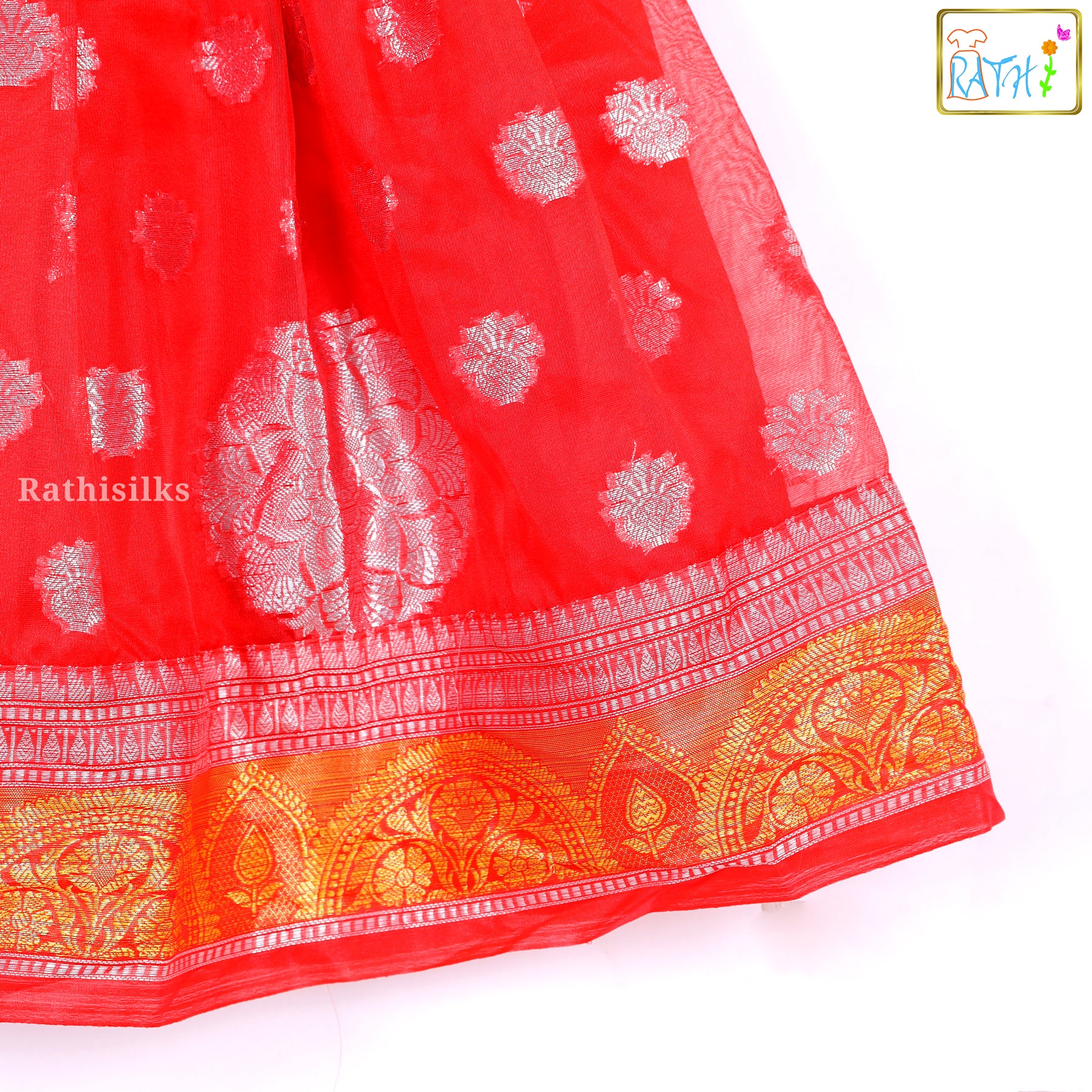 This gorgeous frock is a classic piece of ethnic wear, dazzling in a bright color and rich metallic work. The entire frock, including the sleeveless bodice and the pleated skirt, is made from a vibrant Red silk-blend fabric. The fabric is intricately patterned with an all-over woven design of scattered Silver or Pale Gold circular floral motifs. The dress is finished with a wide, traditional Gold Brocade Border at the hem, featuring a detailed, ornate pattern. The sleeveless, round-neck design and full, flared cut make it comfortable yet formal for any celebration.