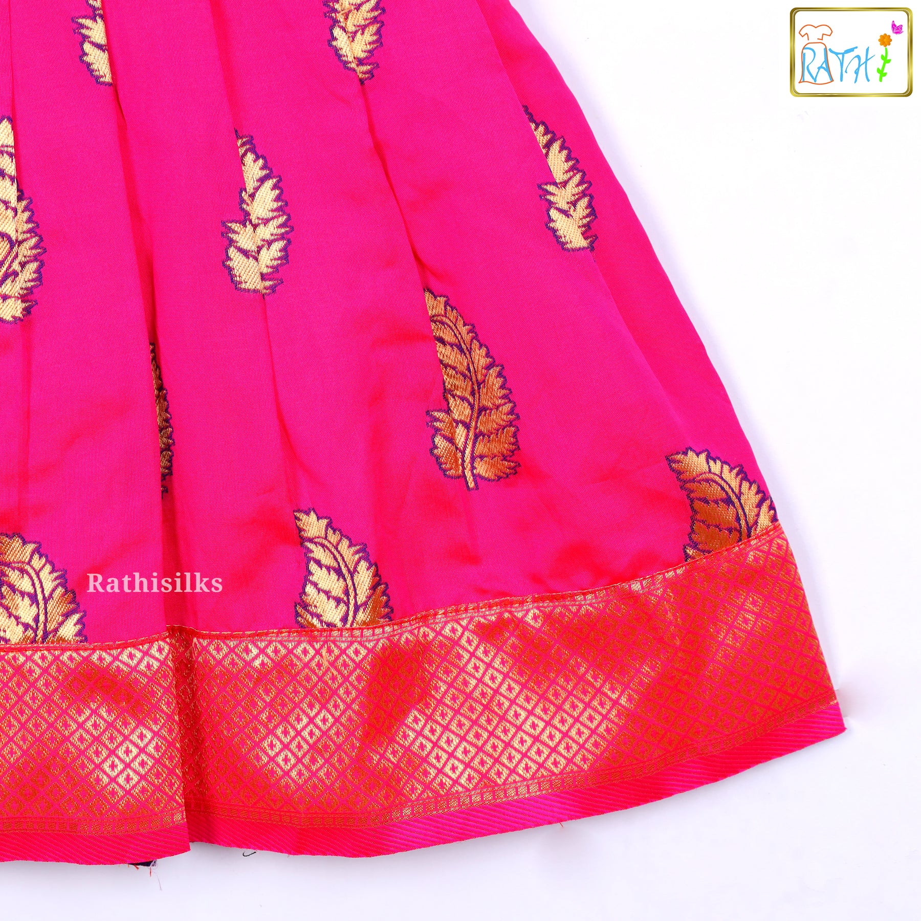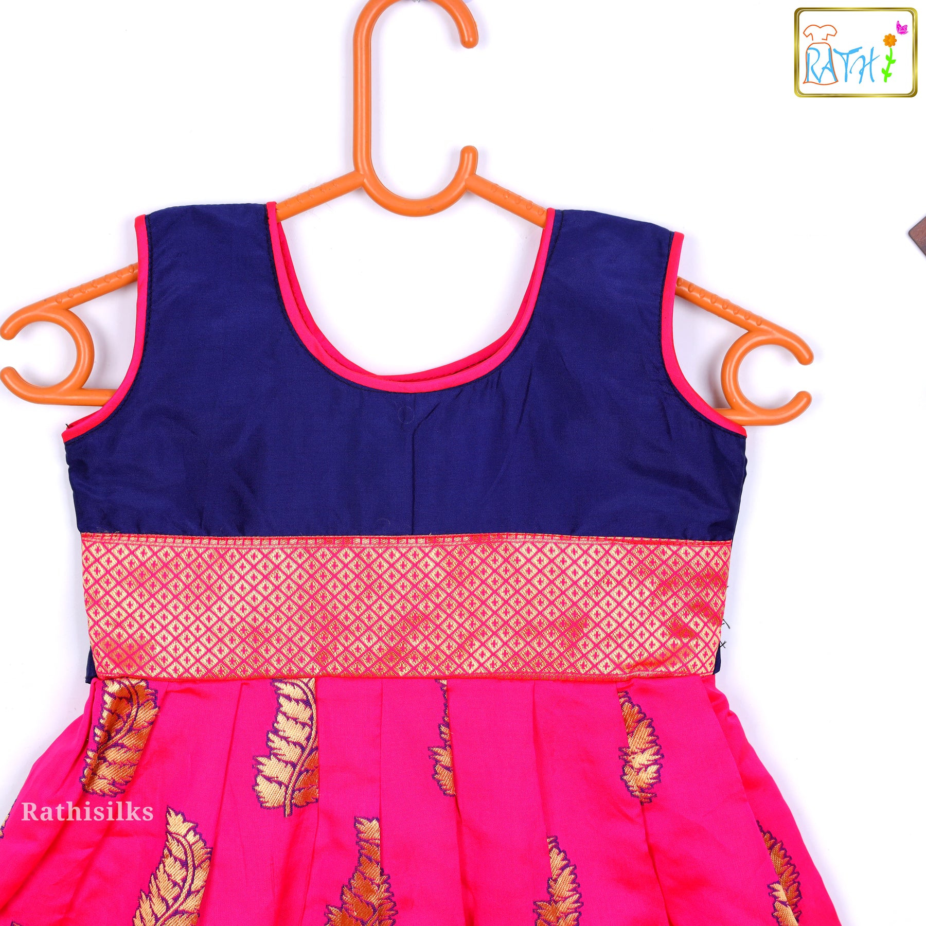 This delightful frock is a graceful blend of traditional charm and modern style, making it a perfect choice for festive occasions. The bodice is designed in deep navy blue for a rich contrast, while the waistband features an intricately woven gold brocade panel. The vibrant pink pleated skirt is adorned with elegant golden leaf motifs and finished with a matching golden brocade border, giving the dress a regal and festive appeal. With its bright color combination and traditional woven detailing, this frock is ideal for weddings, festivals, and special celebrations.