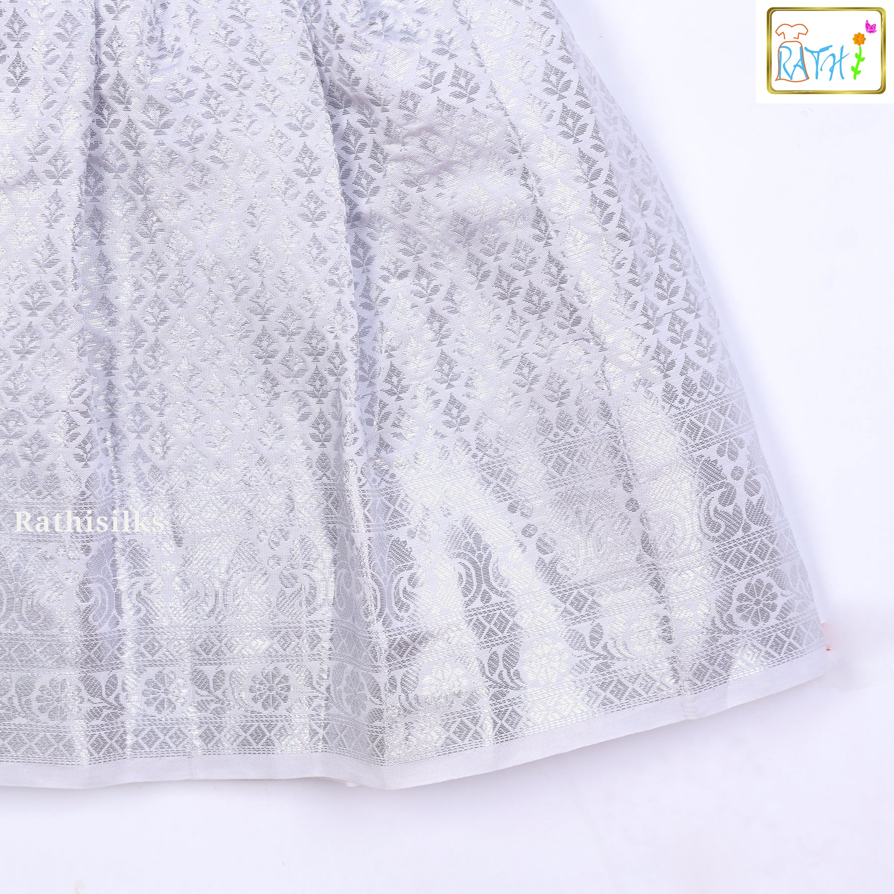 · Brocade Skirt : The lower half features an intricate, woven silver brocade pattern that adds a touch of traditional elegance.