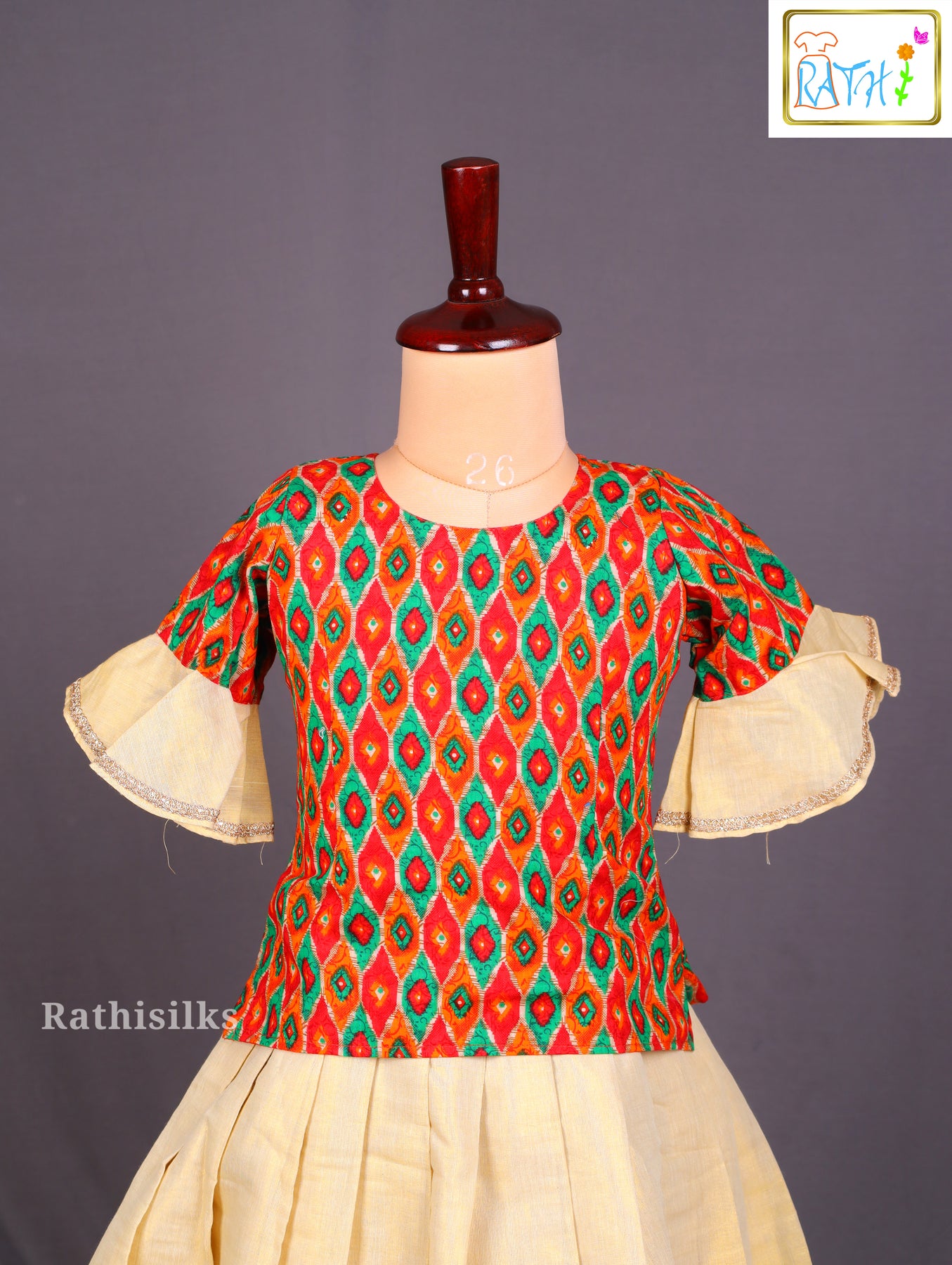 This festive Pavadai Sattai features a striking combination of traditional print and modern styling. The blouse is a bold statement piece, showcasing a detailed Ikat-style diamond print in vibrant shades of red and deep green. It is finished with unique three-quarter length bell sleeves in a contrasting cream fabric, trimmed with subtle gold zari. The cream/light beige skirt is beautifully pleated and provides an elegant contrast to the bright top. The skirt hem is accented with a wide border matching the vibrant Ikat-style diamond pattern of the blouse, trimmed with silver zari. This unique set is ideal for cultural programs and festive occasions.