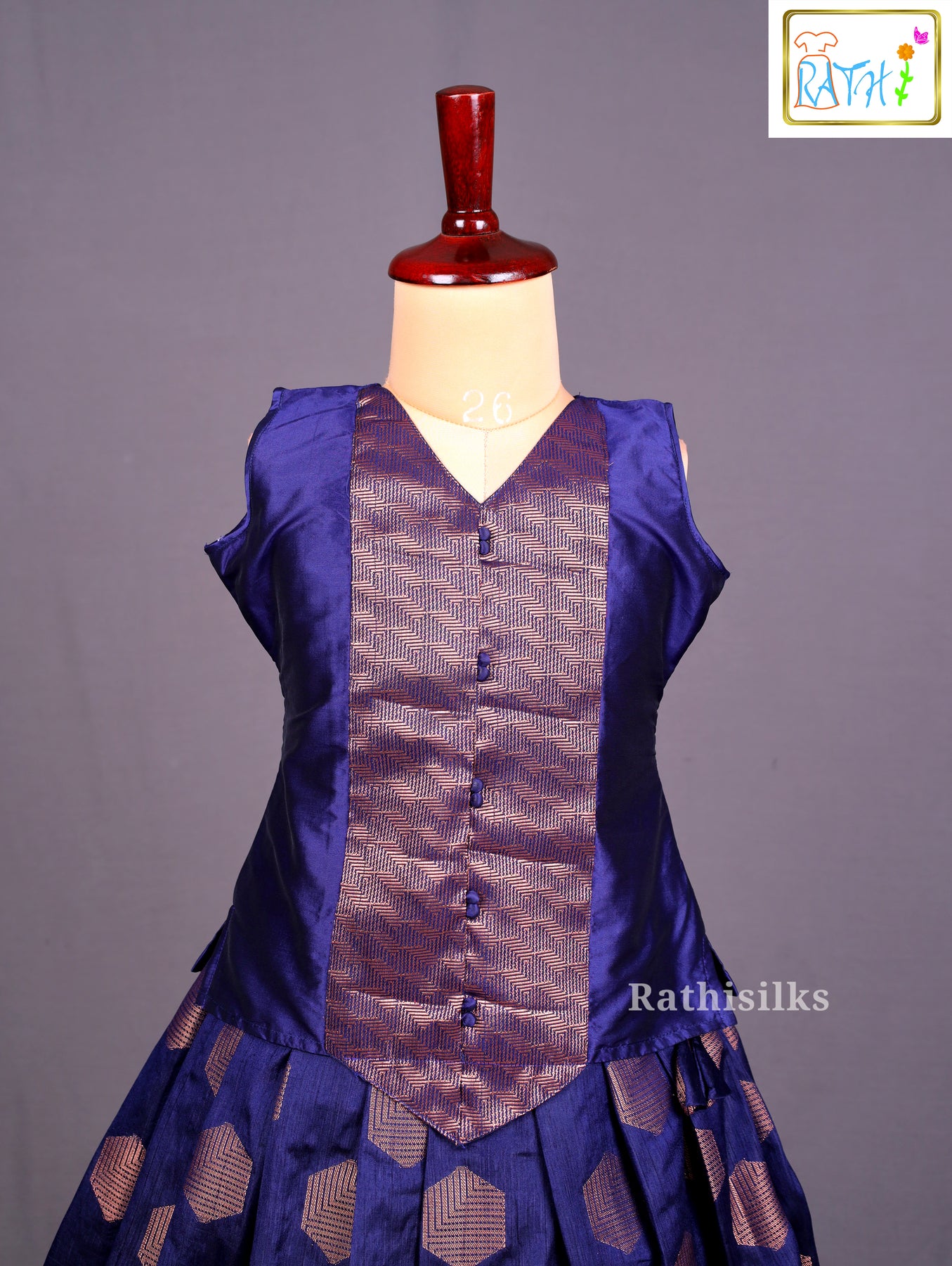 This regal and sophisticated Pavadai Sattai set features a rich color combination of deep Royal Blue and shimmering Copper/Bronze zari work. The sleeve-less blouse has a simple, sleek cut with a central panel featuring a fine vertical stripe weave in copper, accented with decorative buttons down the front, creating the illusion of a vest or jacket front. The neckline is a flattering V-neck.