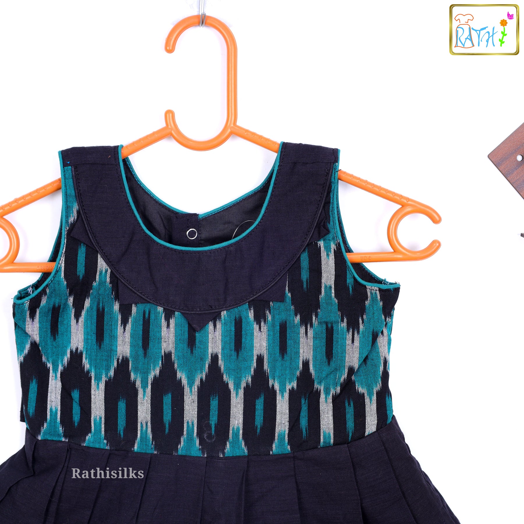 This stylish frock is a perfect blend of tradition and modernity, featuring the timeless beauty of Ikat weaving. The bodice is beautifully patterned with teal and black Ikat motifs, while the skirt is crafted in solid navy blue with neat pleats for a graceful fall. A matching Ikat border at the hemline ties the design together, adding balance and vibrancy. With its sleeveless cut and soft cotton comfort, this frock is ideal for casual gatherings, festive occasions, or as a chic everyday outfit.