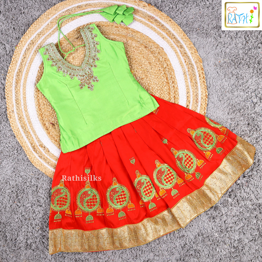 Green Embroidered Blouse with Red Art Silk Pavadai Set