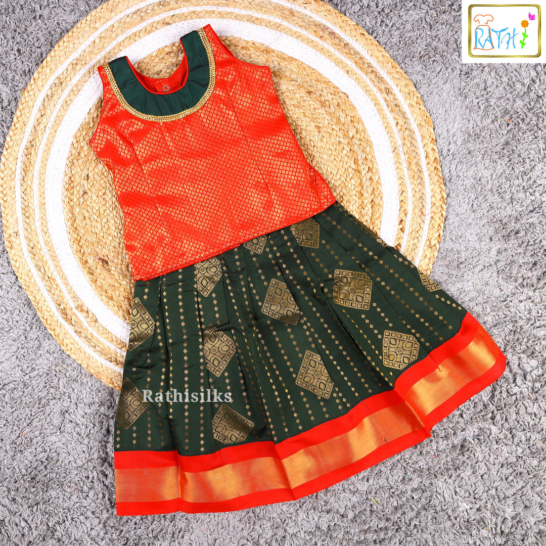 Orange Karishma Top with Green Zig-Zag Art Silk Pavadai Set