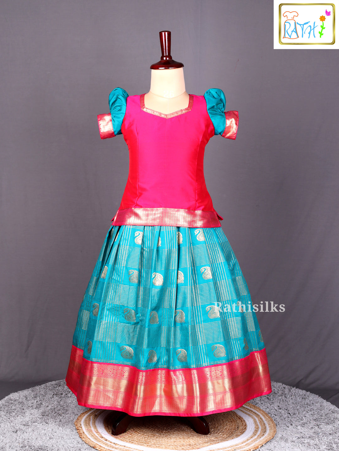 Pink Karishma Top with Aqua Blue Art Silk Pavadai Set