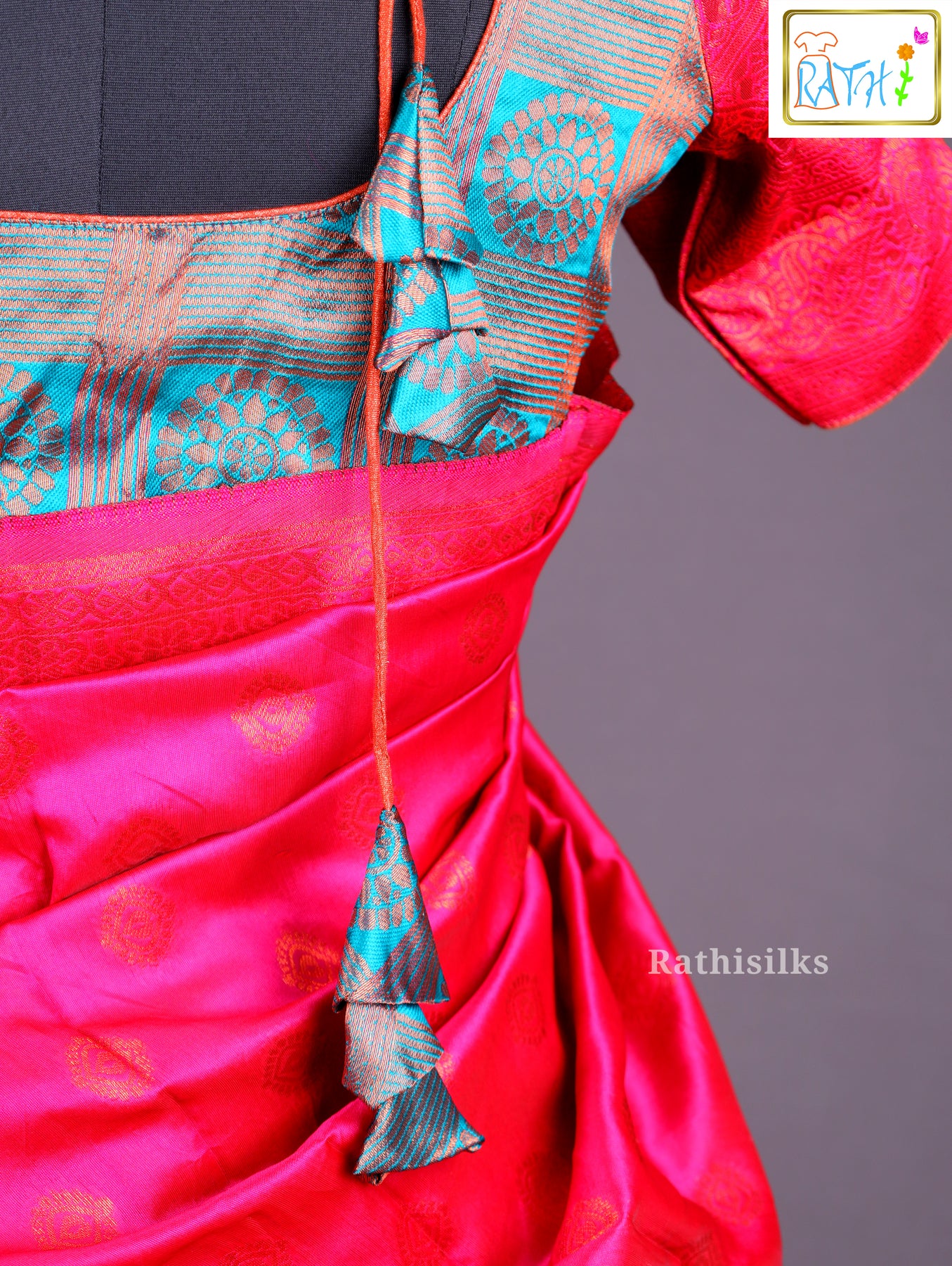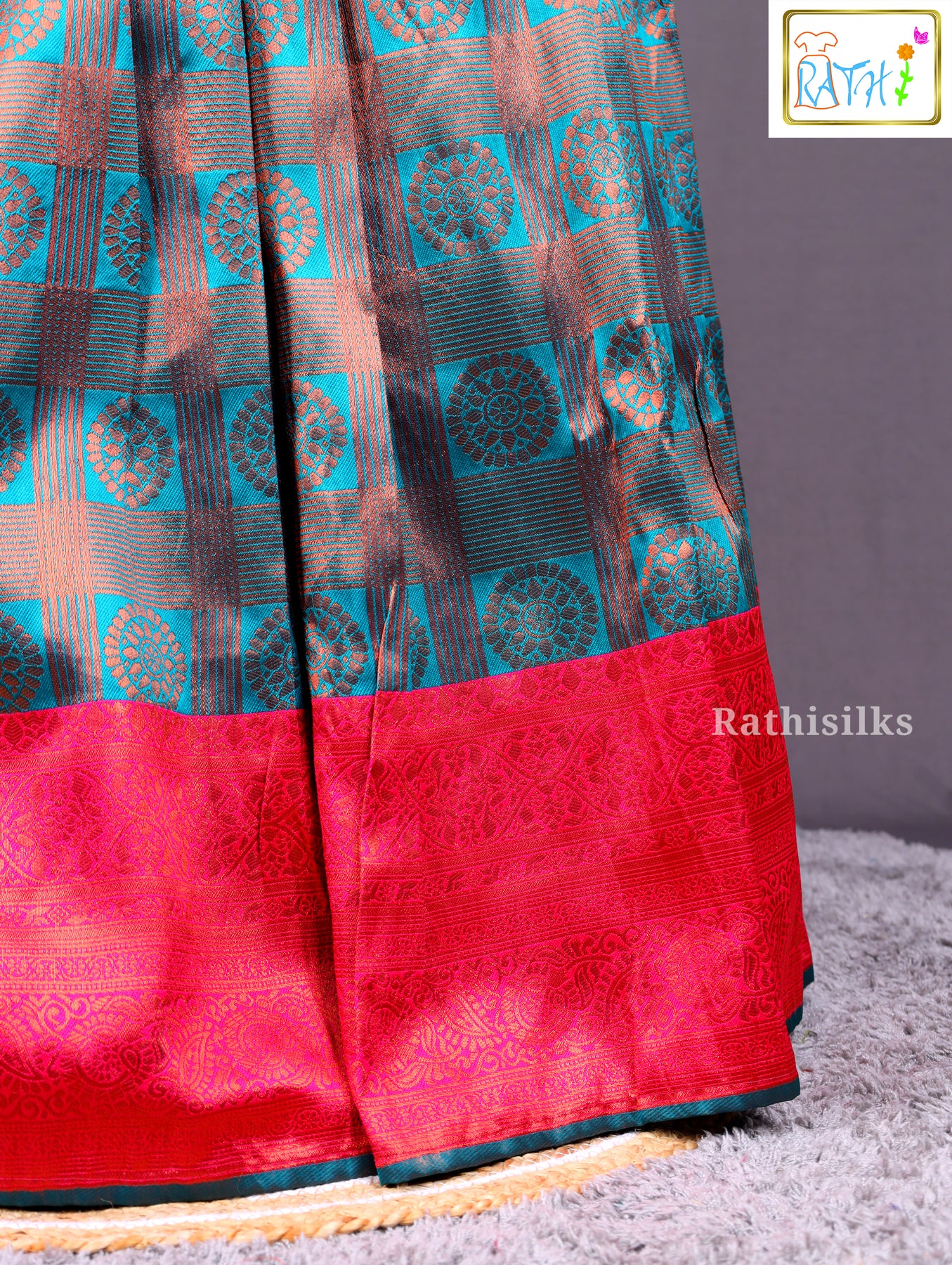 This vibrant half saree ensemble makes a bold statement with its unique color combination. The lehenga features a beautiful tie-dye-style pattern in teal, blue, and black with intricate brocade weaving, all finished with a broad hot pink border. The vibrant hot pink dupatta has a matching woven brocade border and is draped over the shoulder. A coordinating teal and hot pink brocade blouse with the same intricate patterns completes this stunning, modern look.