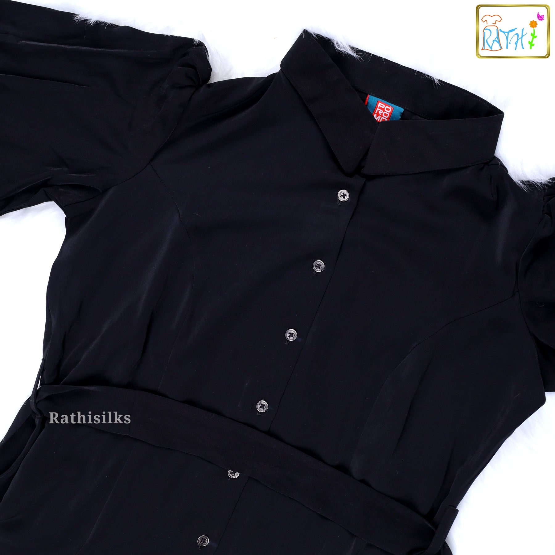 Command attention with this sleek Black Collared Shirt Dress/Kurti. This sophisticated piece features a classic shirt collar and a fitted, button-down silhouette that is cinched with a matching fabric belt. The subtle puff sleeves add a touch of modern femininity. Crafted              for a powerful yet comfortable look, the long-line fit makes it perfect to wear as a dress or paired over leggings/trousers for a sharp, contemporary ensemble.