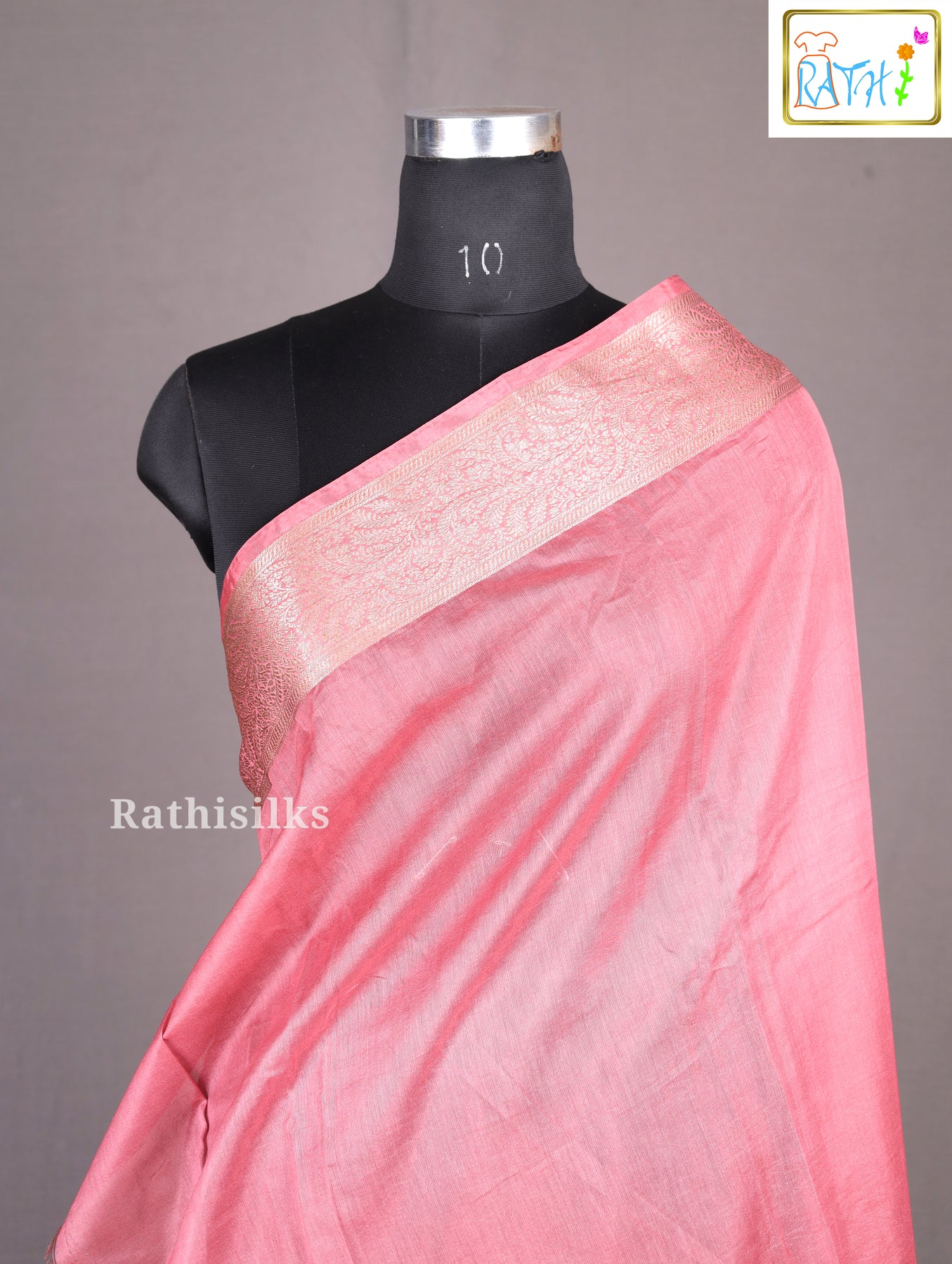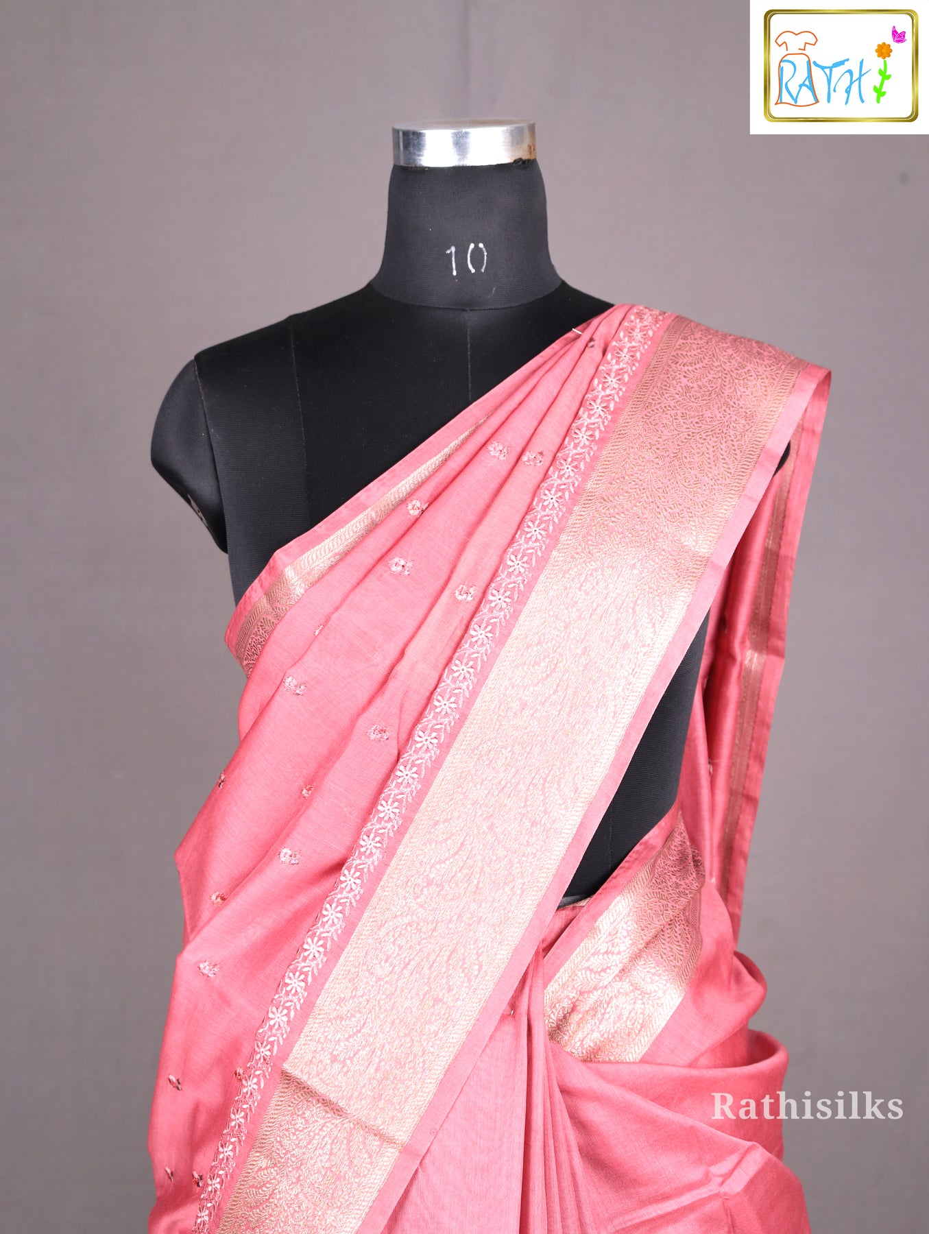 · Design : Soft coral body with delicate embellishments, complemented by a fine zari border.