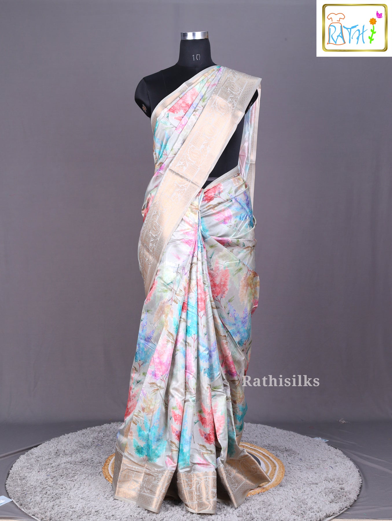 Elegant Digital Floral Print Silk Saree with Rich Gold Zari Border