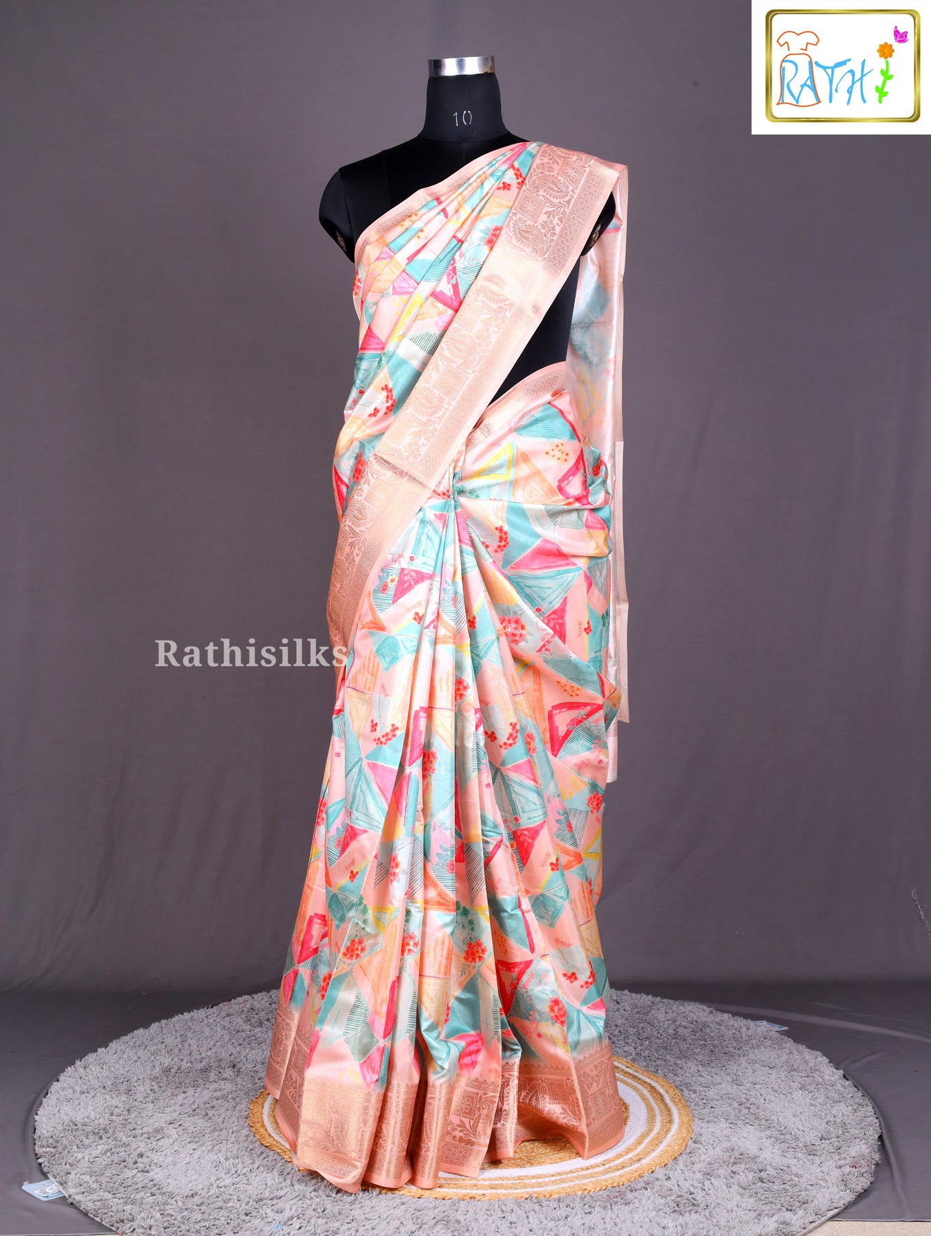 This stunning synthetic saree is a perfect blend of modern abstract art and traditional grandeur. The body of the saree showcases a lively geometric print in a cheerful, modern palette, featuring shades of mint green, blush pink, coral, and soft aqua. This contemporary pattern is beautifully framed by a wide, opulent brocade border in a luxurious champagne or rose gold zari, which provides a rich, textured contrast. Its lightweight and smooth synthetic fabric ensures an easy, beautiful drape, making it an excellent statement piece for fashionable gatherings, parties, or special semi-formal occasions.