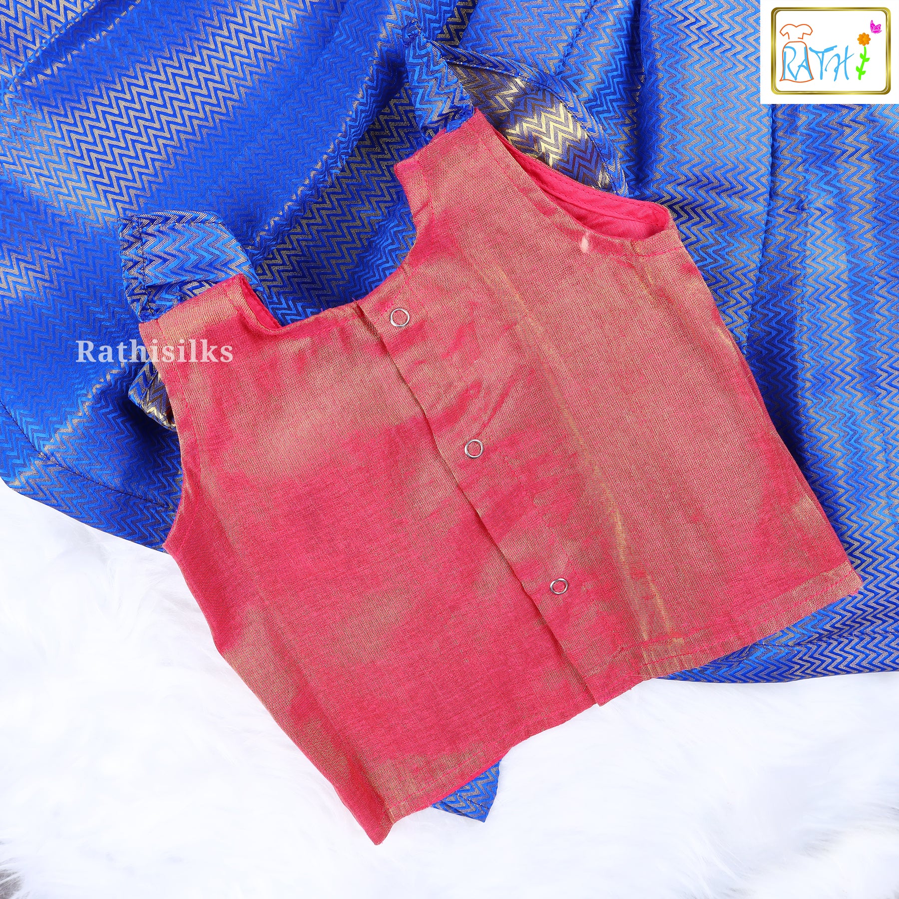 The pavadai comes in a rich blue art silk weave with zig-zag styled patterns, giving it a shiny and royal finish. The pleated skirt offers a beautiful flare, making it ideal for celebrations, functions, and special occasions. Lightweight, soft, and comfortable—this set is perfect for kids to wear for longer hours without discomfort.