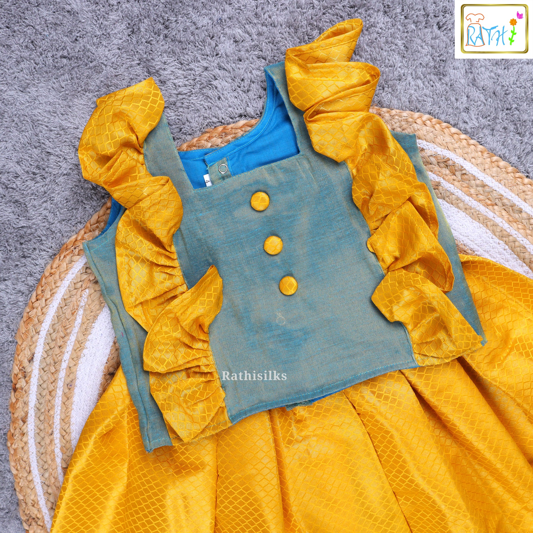 This vibrant Green & Yellow Pavadai Sattai set blends rich traditional design with bold colors. The top features a green fabric with puffed sleeves and a square neckline for a festive and traditional look. The bright yellow skirt is crafted in a pleated design with a shiny finish, adding a graceful and elegant touch. Ideal for cultural celebrations, weddings, and festivals, this set offers a perfect blend of style and comfort.