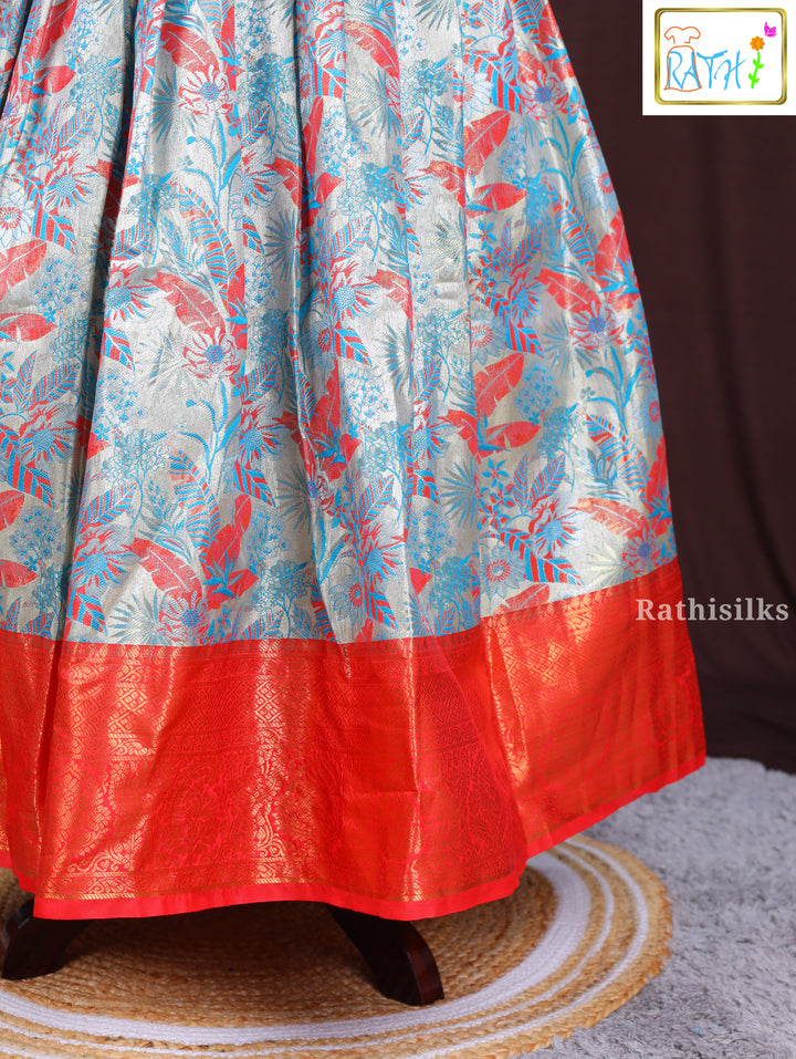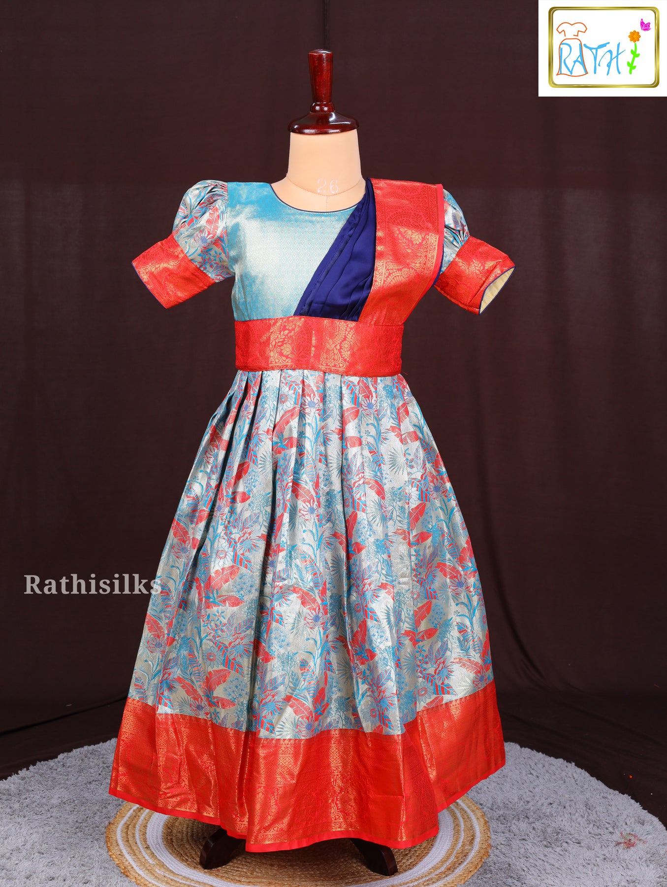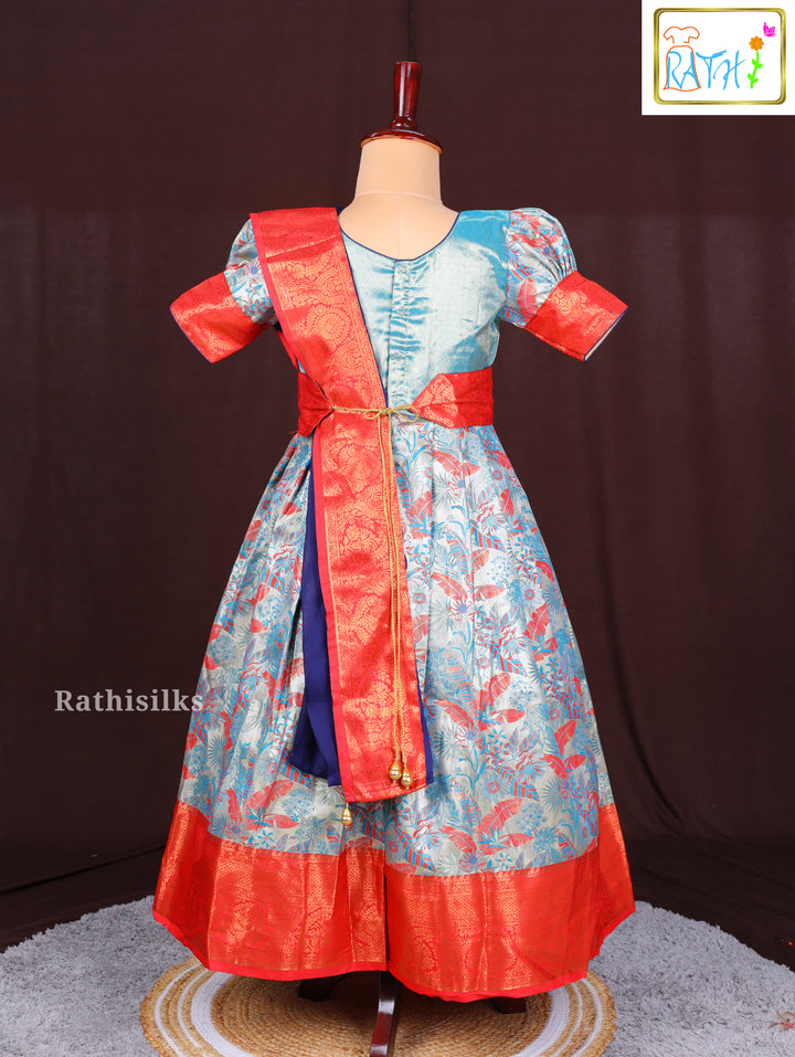 Let your little one shine in this enchanting Blue and Red Art Silk Saree Dress, designed to capture the elegance of a traditional half-saree in a comfortable, child-friendly stitched format. The vibrant blue brocade skirt is beautifully woven with delicate floral and fish motifs, while the striking red brocade blouse features charming puff sleeves and a complementing red waistband. A deep navy blue pallu is pre-draped for easy wear, and the wide, shimmering red zari border on the skirt adds a touch of festive grandeur. This outfit is perfect for weddings, festivals, and cultural events, blending rich tradition with effortless style.