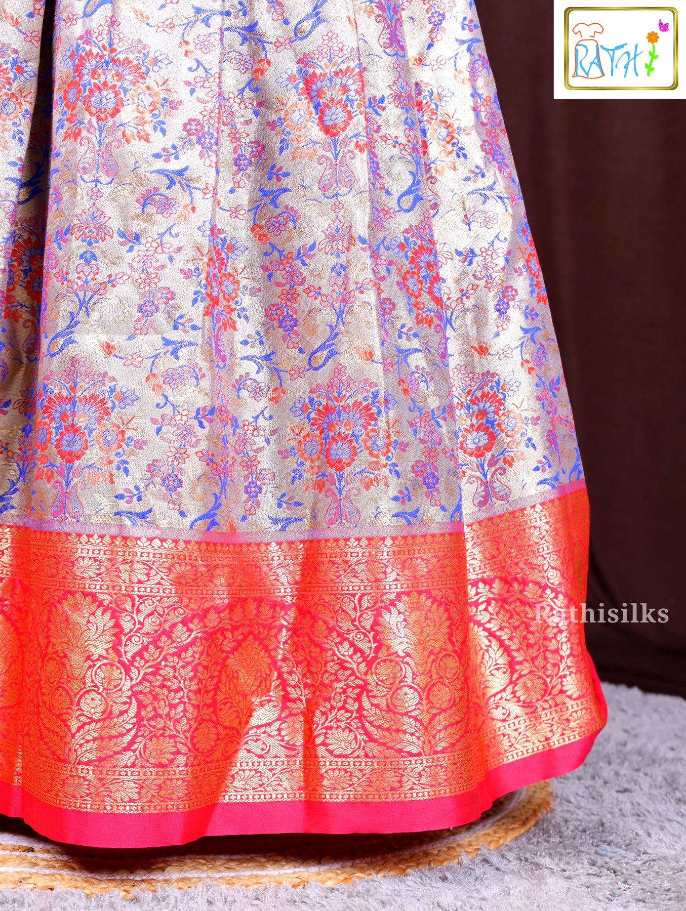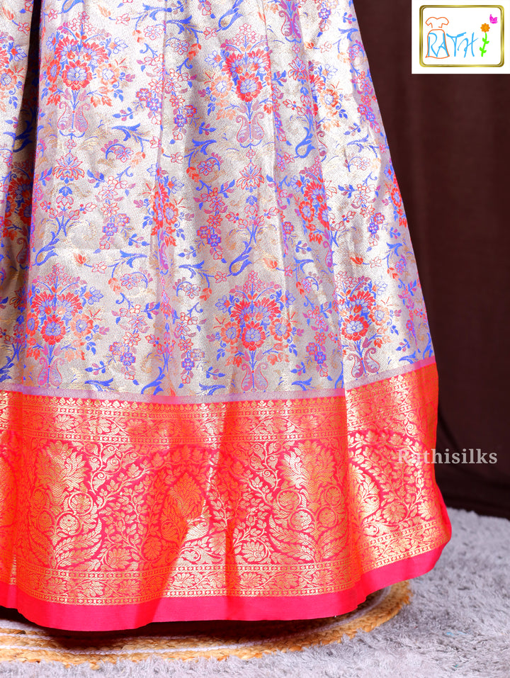 - Skirt : Silver-Blue Brocade with Red & Blue Floral Woven Patterns, Red Zari Border