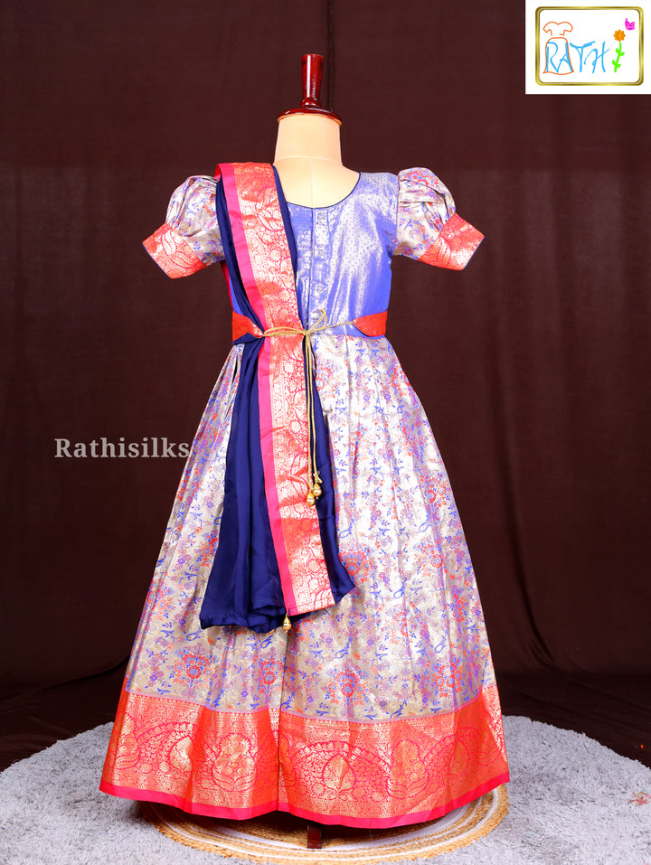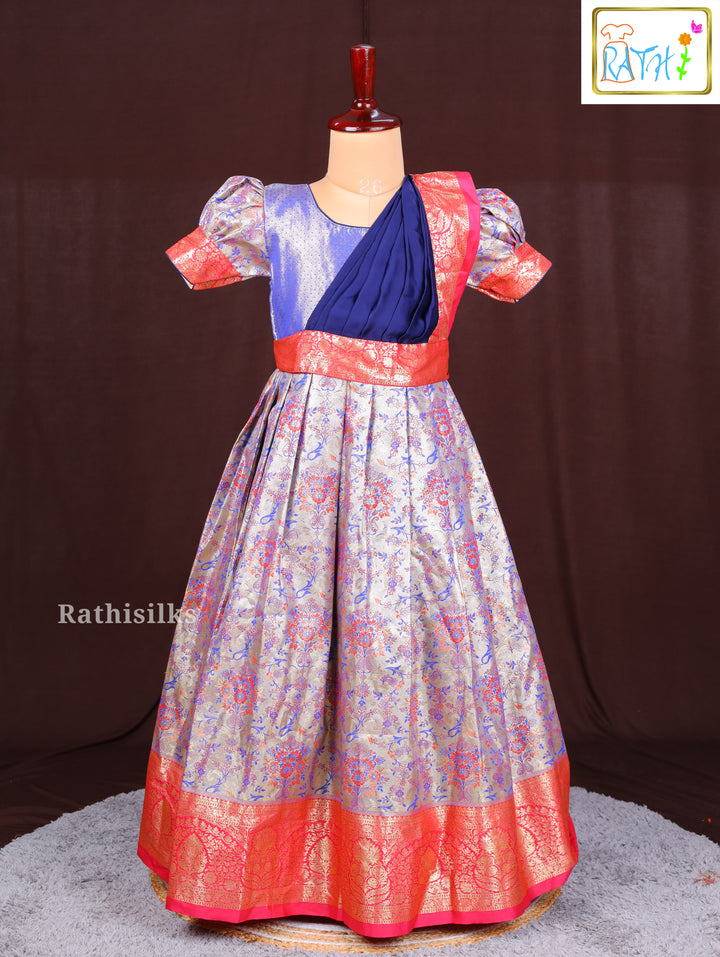 Make a dazzling impression with this Stunning Silver-Blue & Red Art Silk Saree Dress. The ensemble features a shimmering silver-blue brocade top with short puff sleeves, complemented by a bold navy blue pre-draped element. The skirt showcases an eye-catching floral pattern in red and blue hues on a silver background, beautifully finished with a bright red zari border. This comfortable stitched saree dress is perfect for festive occasions, parties, and cultural events where a unique and vibrant look is desired.