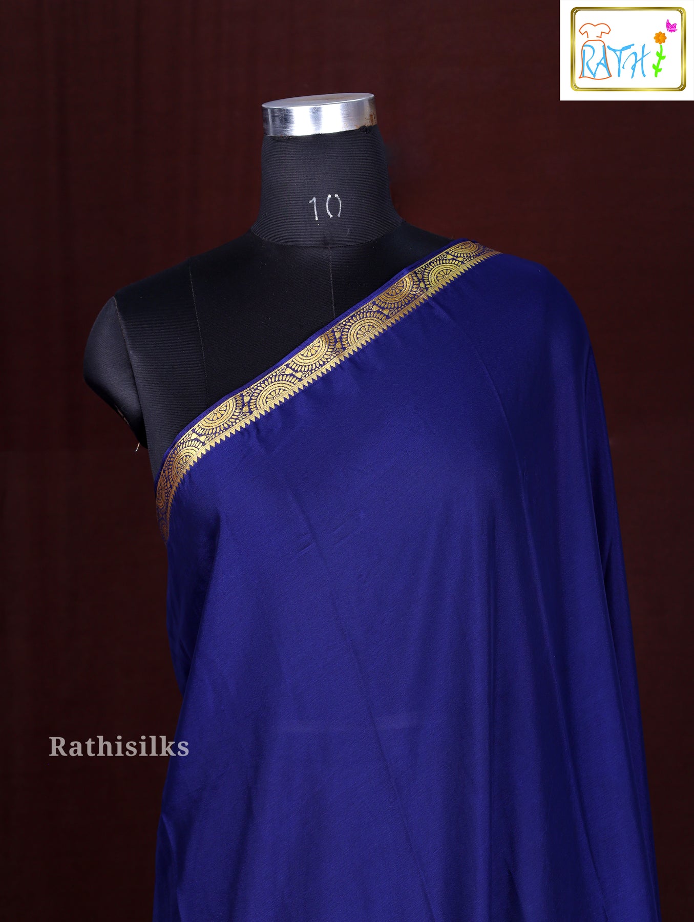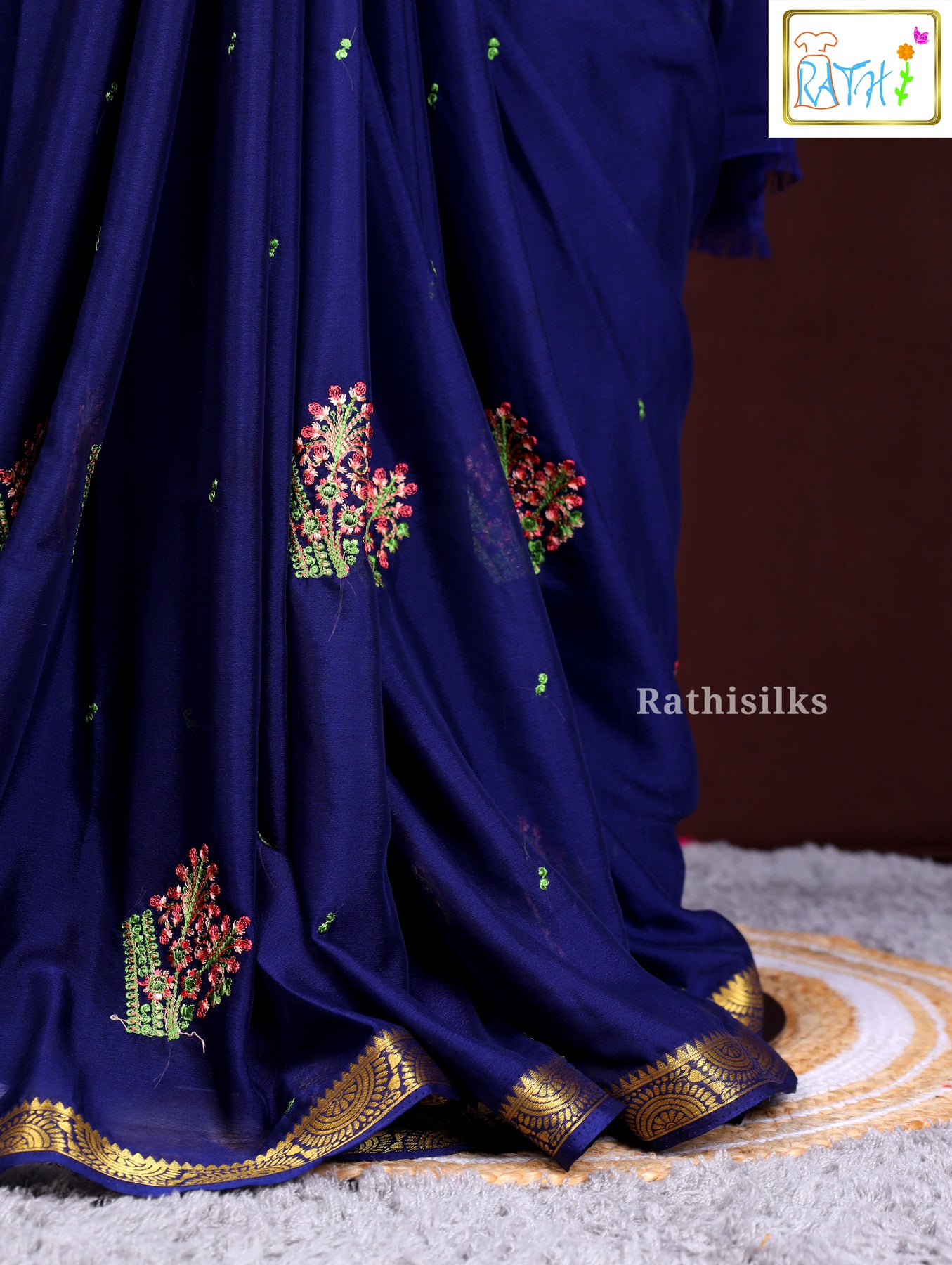This graceful saree is a perfect blend of rich color and delicate detailing. The body is a deep navy blue, crafted from a soft, lightweight synthetic that drapes beautifully. The saree is adorned with elegant floral embroidery scattered across the body, featuring motifs in shades of red, pink, and yellow. A classic gold woven border adds a touch of traditional opulence and completes the sophisticated look.
