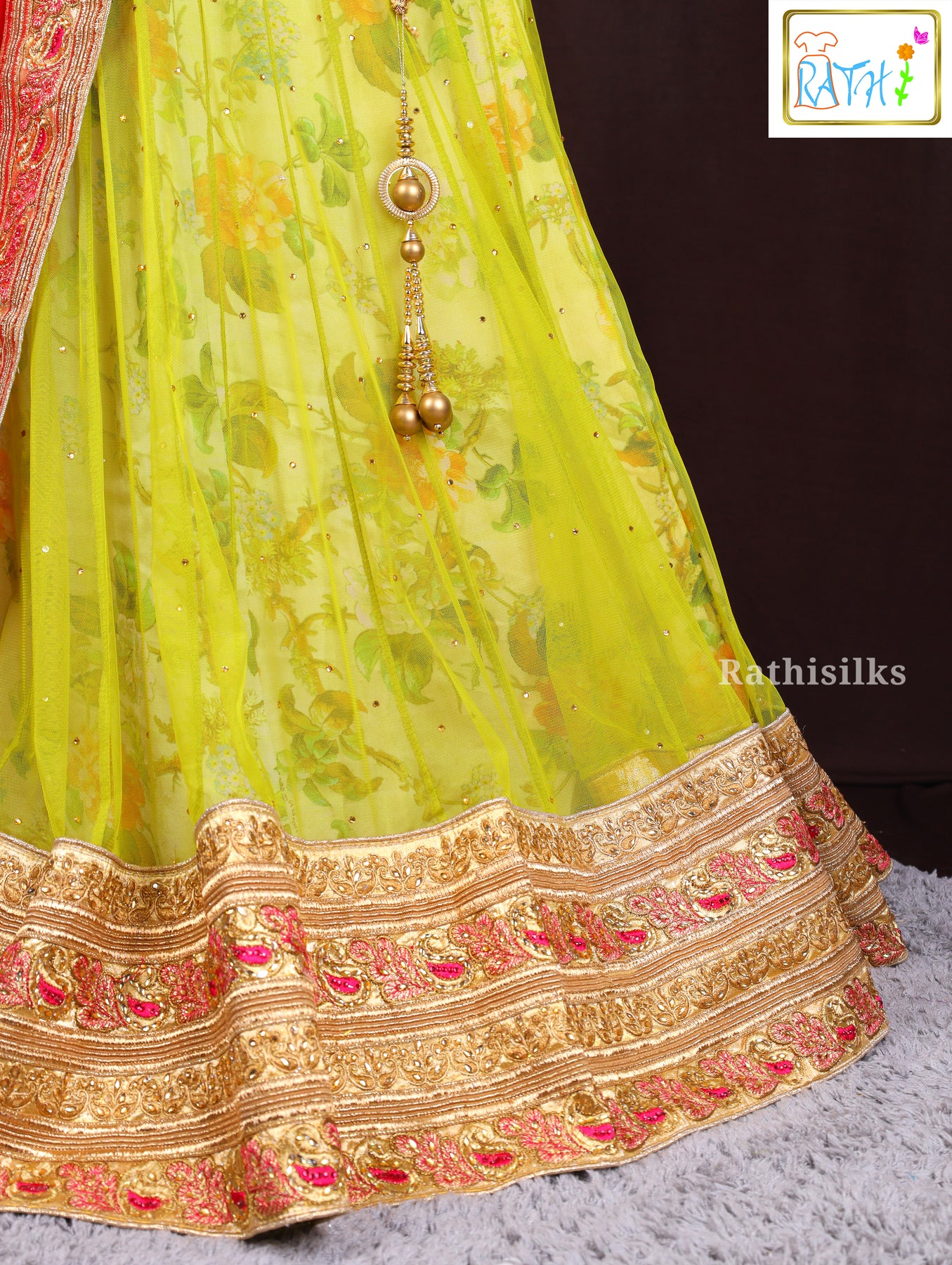 Fresh Lime Green Floral Lehenga with Gold Blouse & Hot Pink Shawl - Lively Festive Fashion