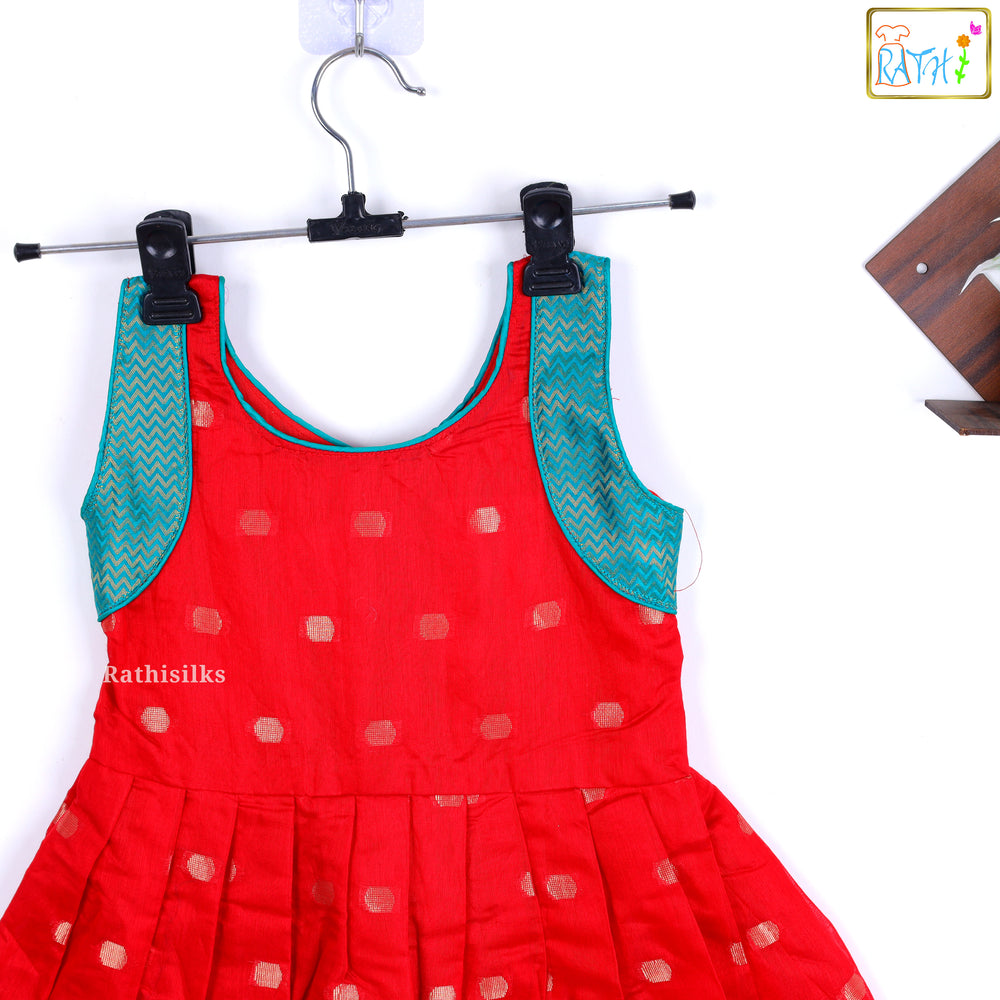 Traditional Red Frock for Girls with Teal Green Zari Border & Woven Buttas