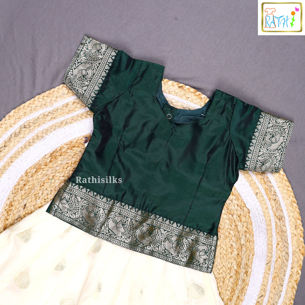 Bottle Green Art Silk Top with Cream Art Silk Pavadai Set