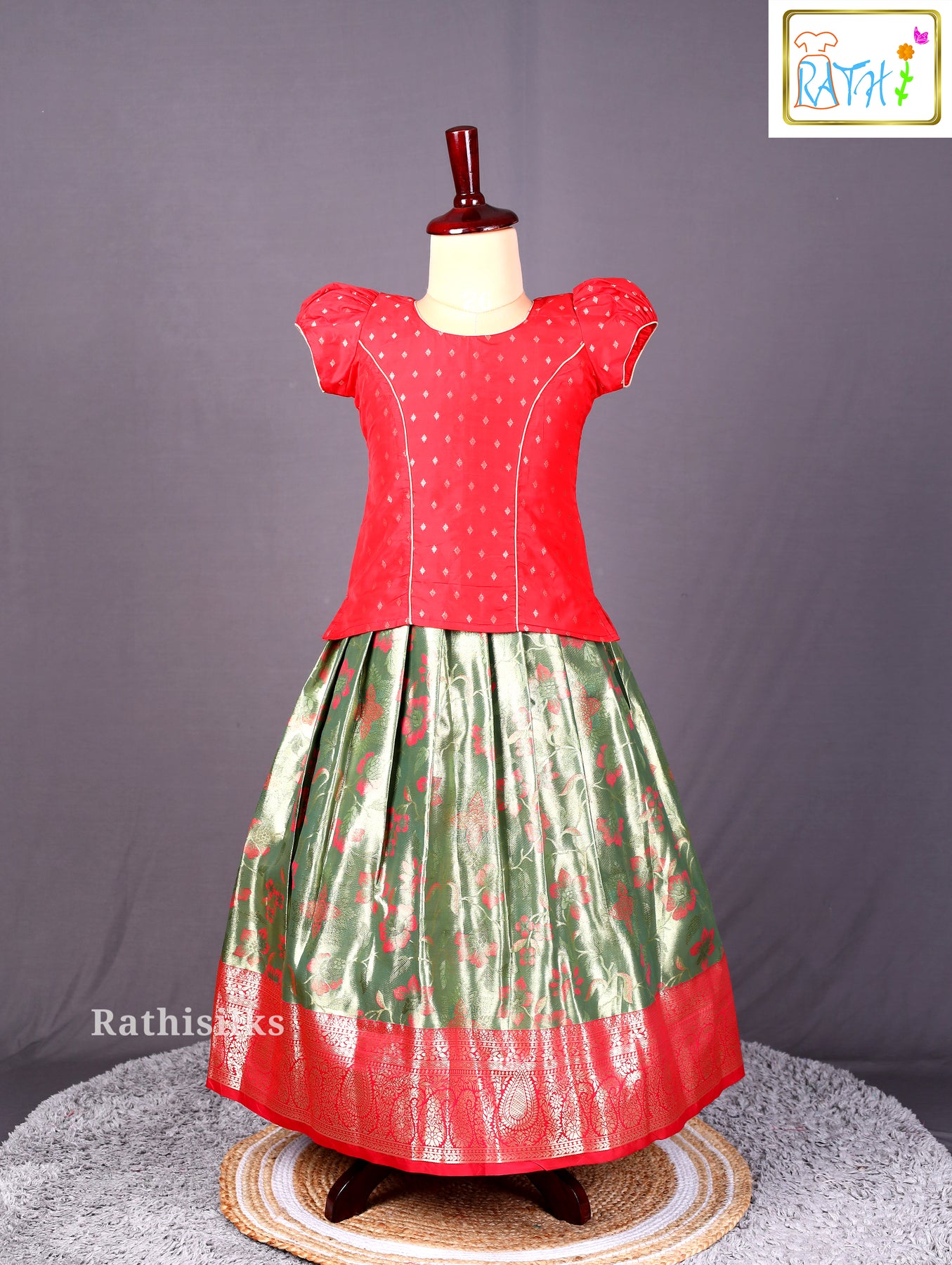 Karishma Top with Art Silk Pavadai Set for Girls – Red & Green Traditional Combo