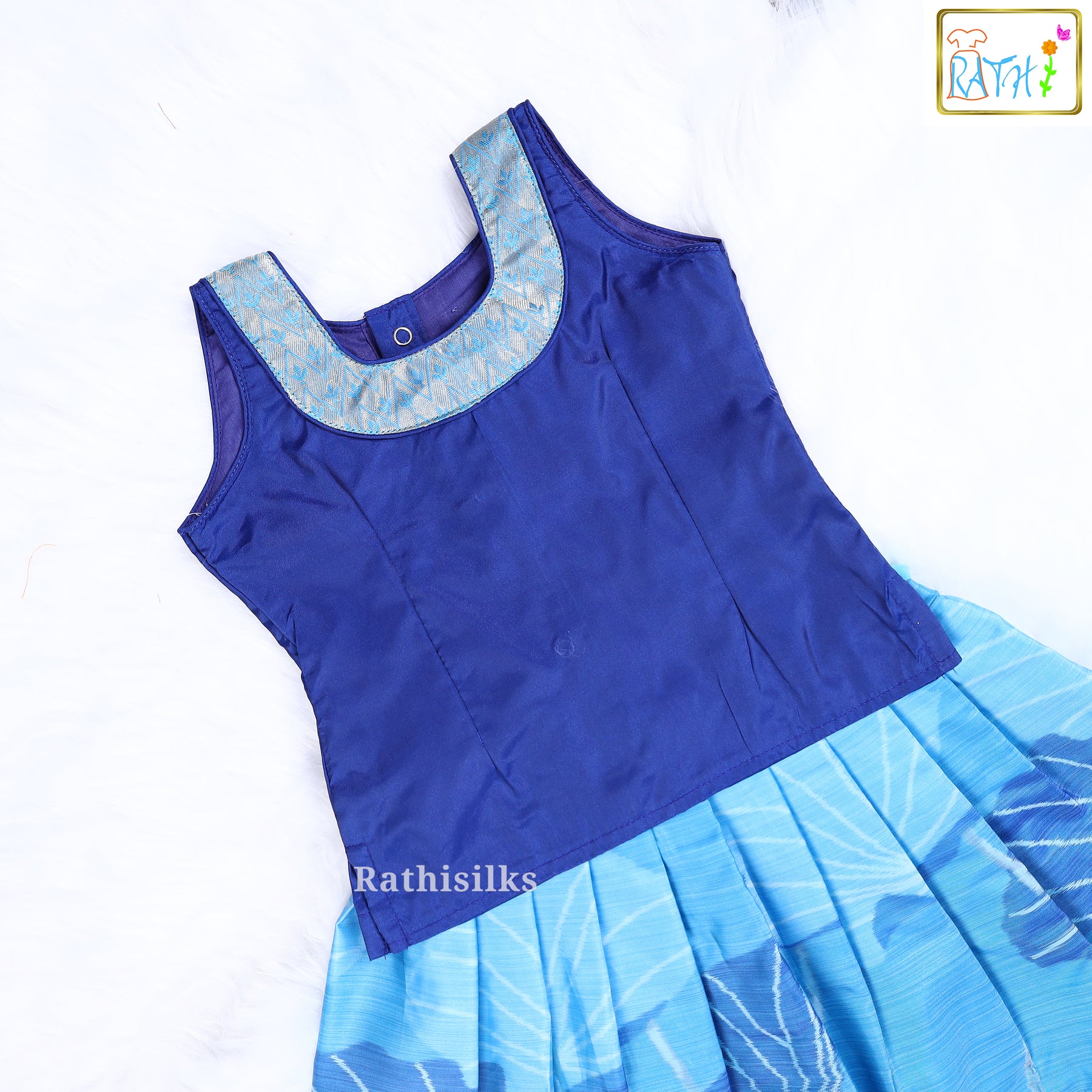 This elegant Art Silk Pavadai Set is designed for little girls who love to dress traditionally with comfort and grace. The outfit features a deep blue blouse with a stylish embroidered neckline that adds a touch of richness to the overall look. The matching pavadai comes in a soothing sky-blue shade with lotus-inspired woven patterns and a shimmering silver zari border, highlighting its festive charm beautifully.