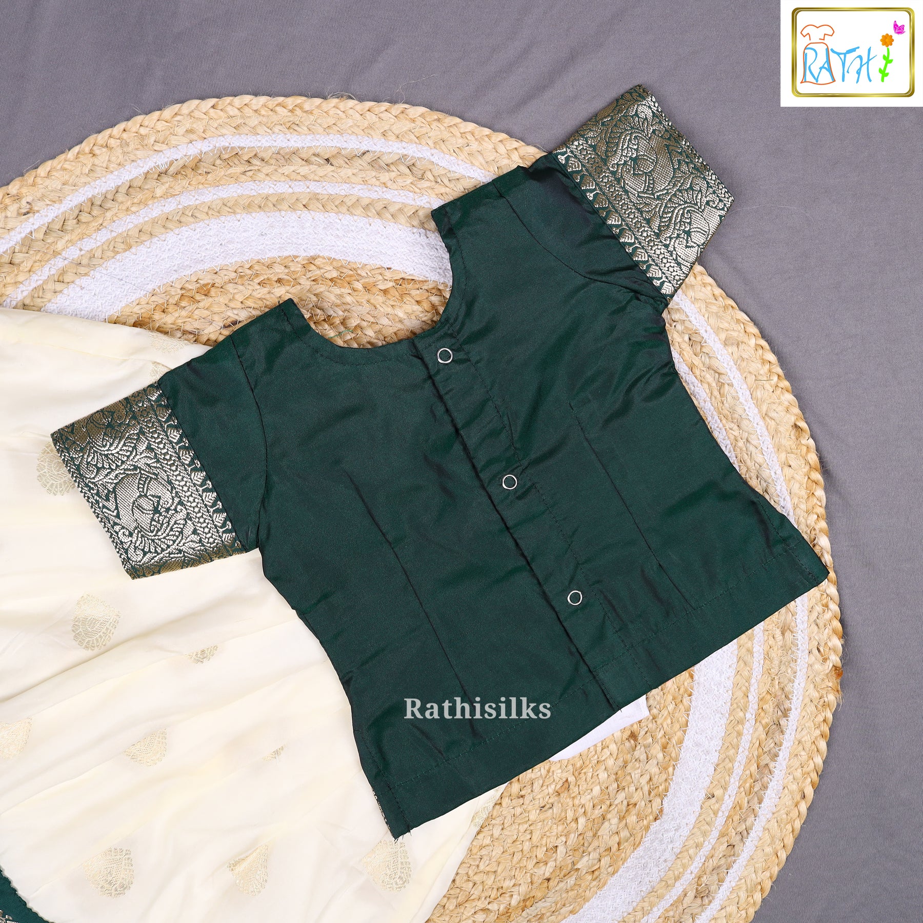 Girls Bottle Green Art Silk Top with Cream Art Silk Pavadai – Traditional Festive Wear Set