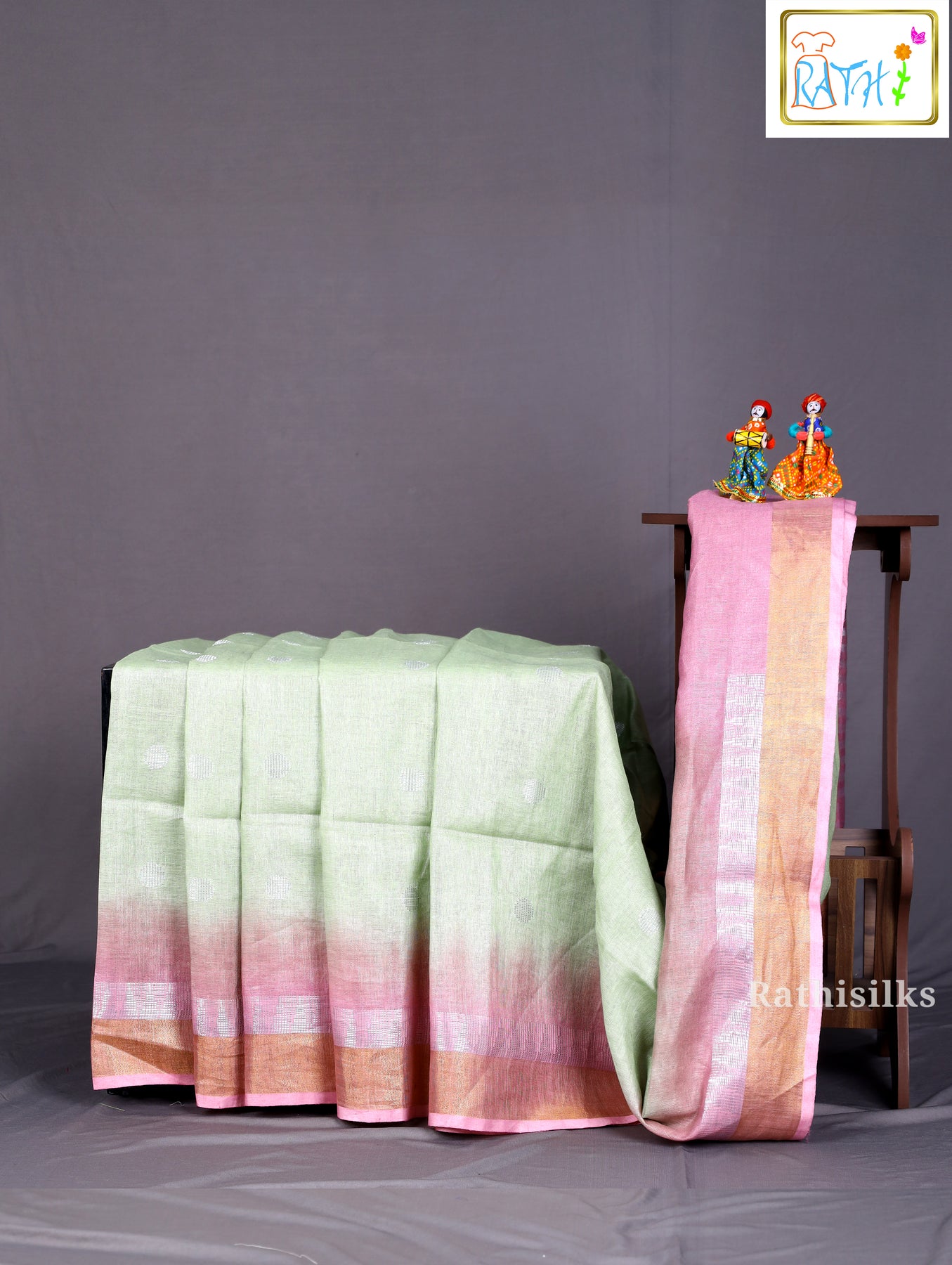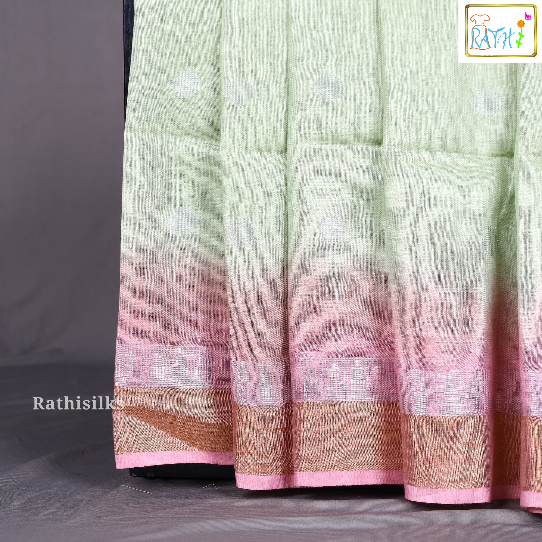 A striking dual-tone pink and gold woven border frames the saree beautifully, bringing in a vibrant contrast and a touch of contemporary elegance. Lightweight and easy to drape, this saree is perfect for festive celebrations, parties, and formal gatherings where you want to look effortlessly sophisticated.
