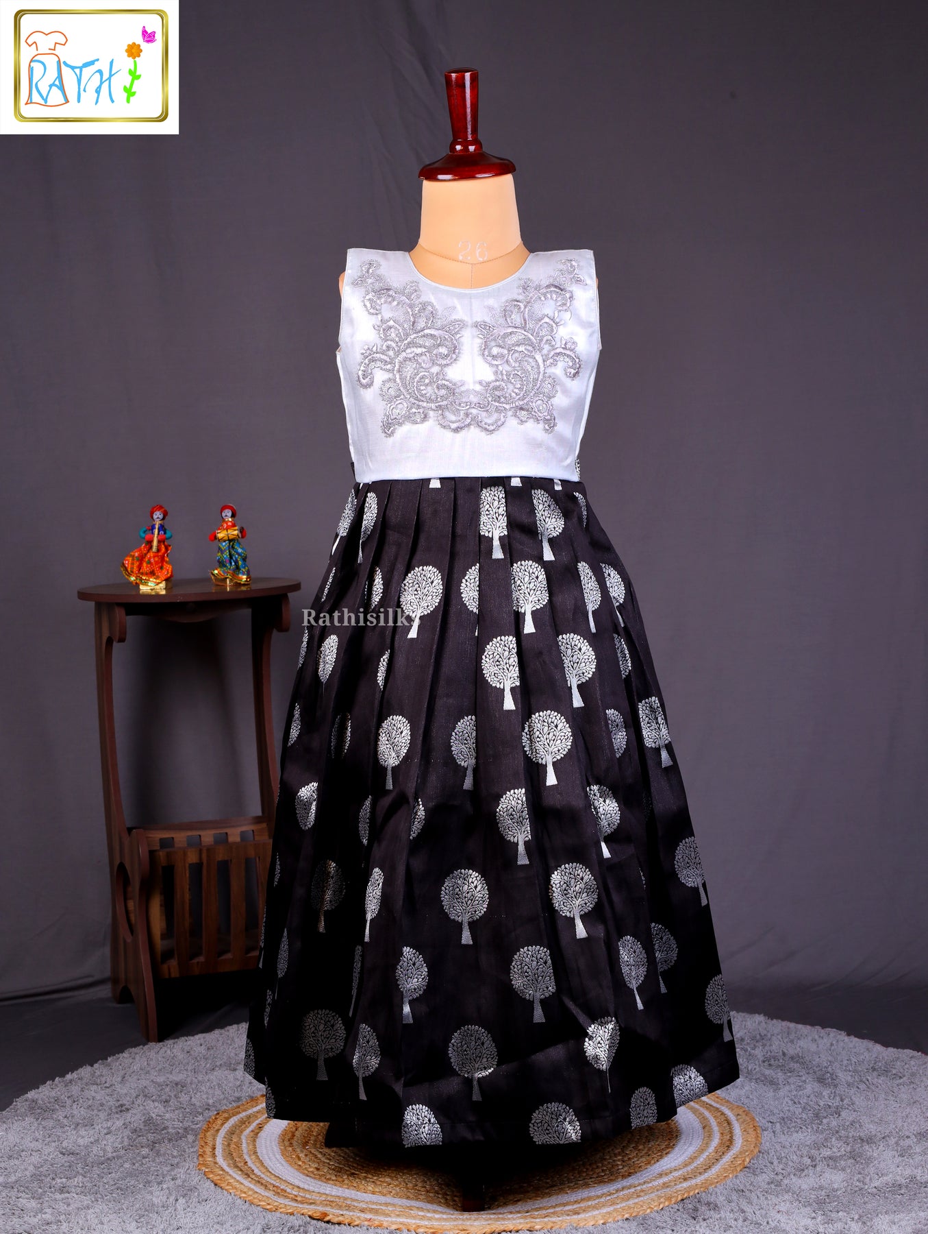 Girls Black and Silver Silk Frock with Embroidered Yoke & Tree Motifs – Festive Wear