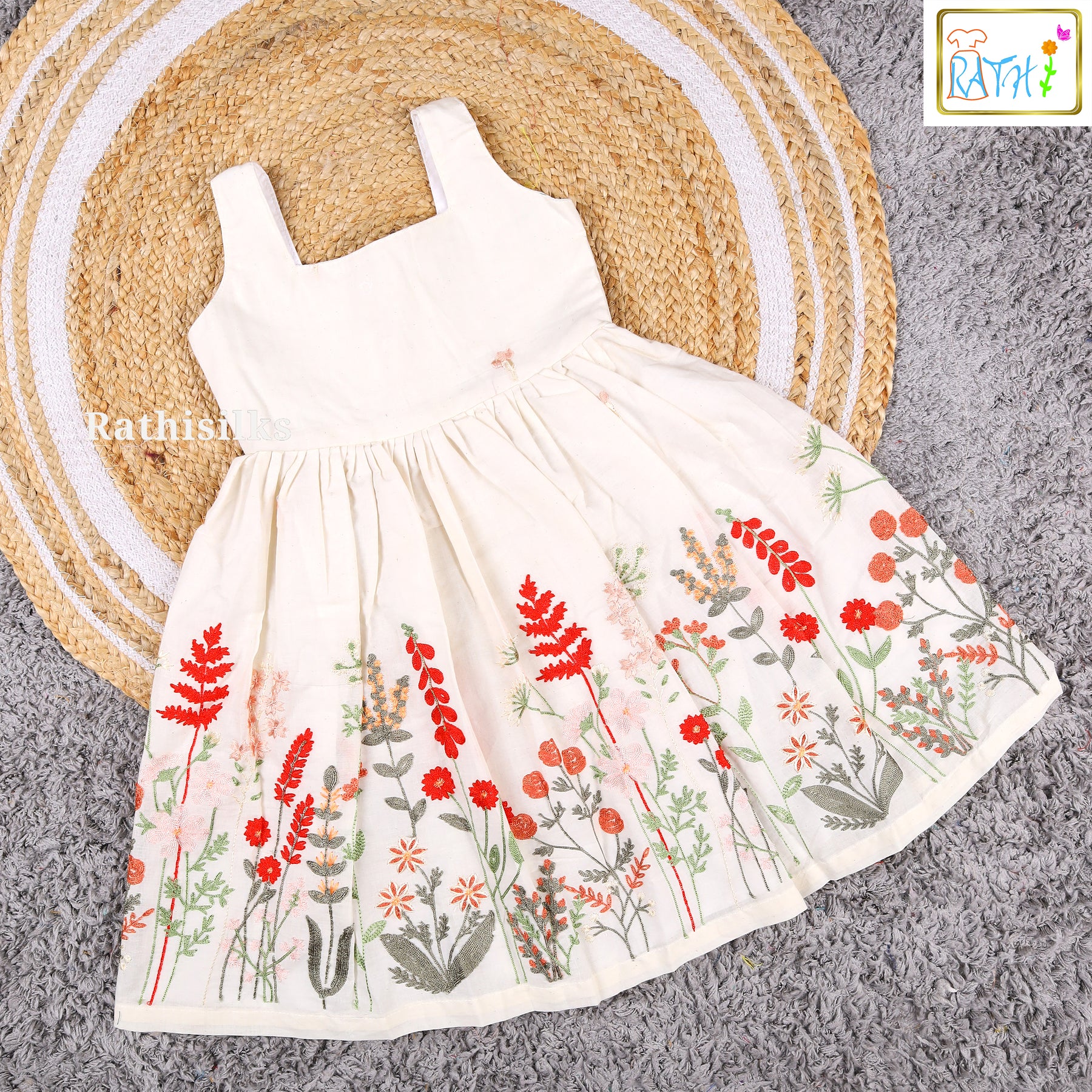 This Elegant Cream & Green Embroidered Cotton Frock features a beautiful blend of traditional embroidery and a stylish attached coat-style design. The frock comes with a soft cream cotton skirt adorned with vibrant floral embroidery in red, green, and natural tones, creating a charming and festive appeal. The upper bodice is designed as an attached green coat-style layer, embellished with fine embroidered motifs that add richness and sophistication to the outfit. Crafted from soft and breathable cotton, this frock ensures maximum comfort for your little one, making it perfect for festive events, cultural functions, birthdays, and family celebrations. The combination of premium embroidery and the coat-style finish makes this frock an eye-catching and elegant choice.