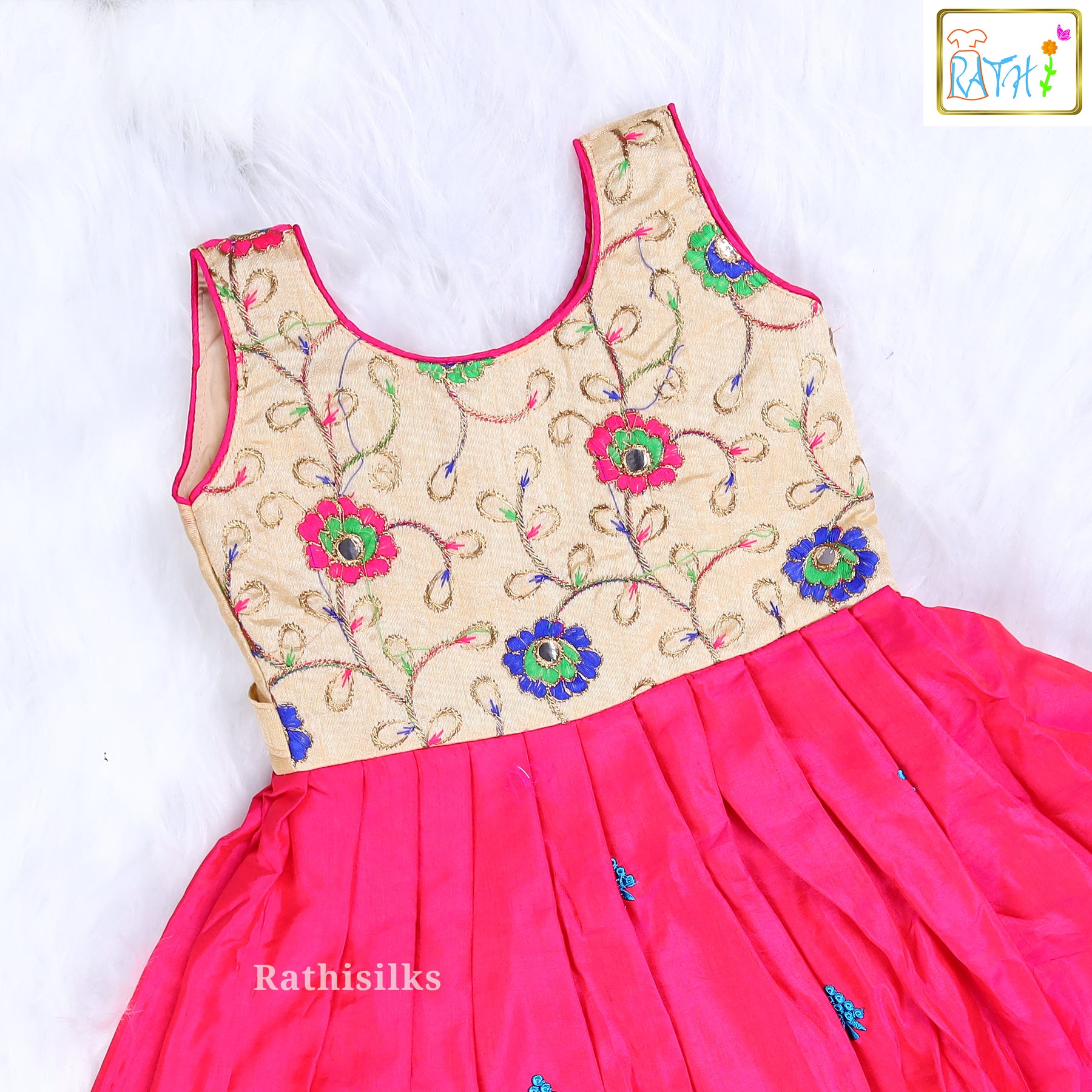 Made from premium art silk, the frock has a smooth finish and a soft feel that keeps kids comfortable throughout the day. The pleated skirt offers a lovely flare, making it ideal for twirling, celebrations, and special occasions. Perfect for parties, weddings, traditional gatherings, and festive events, this frock brings together style, comfort, and elegance effortlessly.