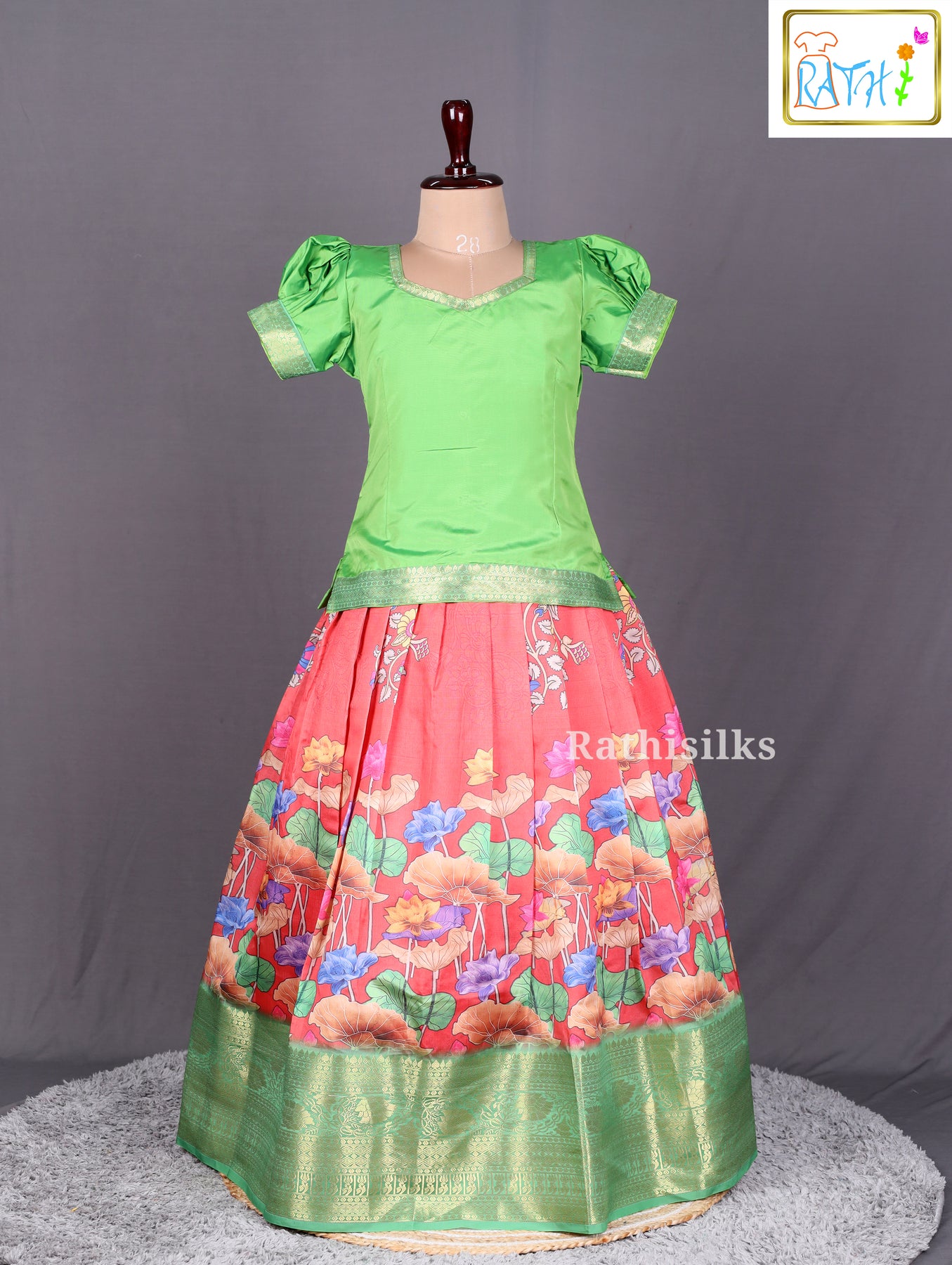 Elegant Green & Coral Art Silk Pavadai Set with Floral Printed Skirt