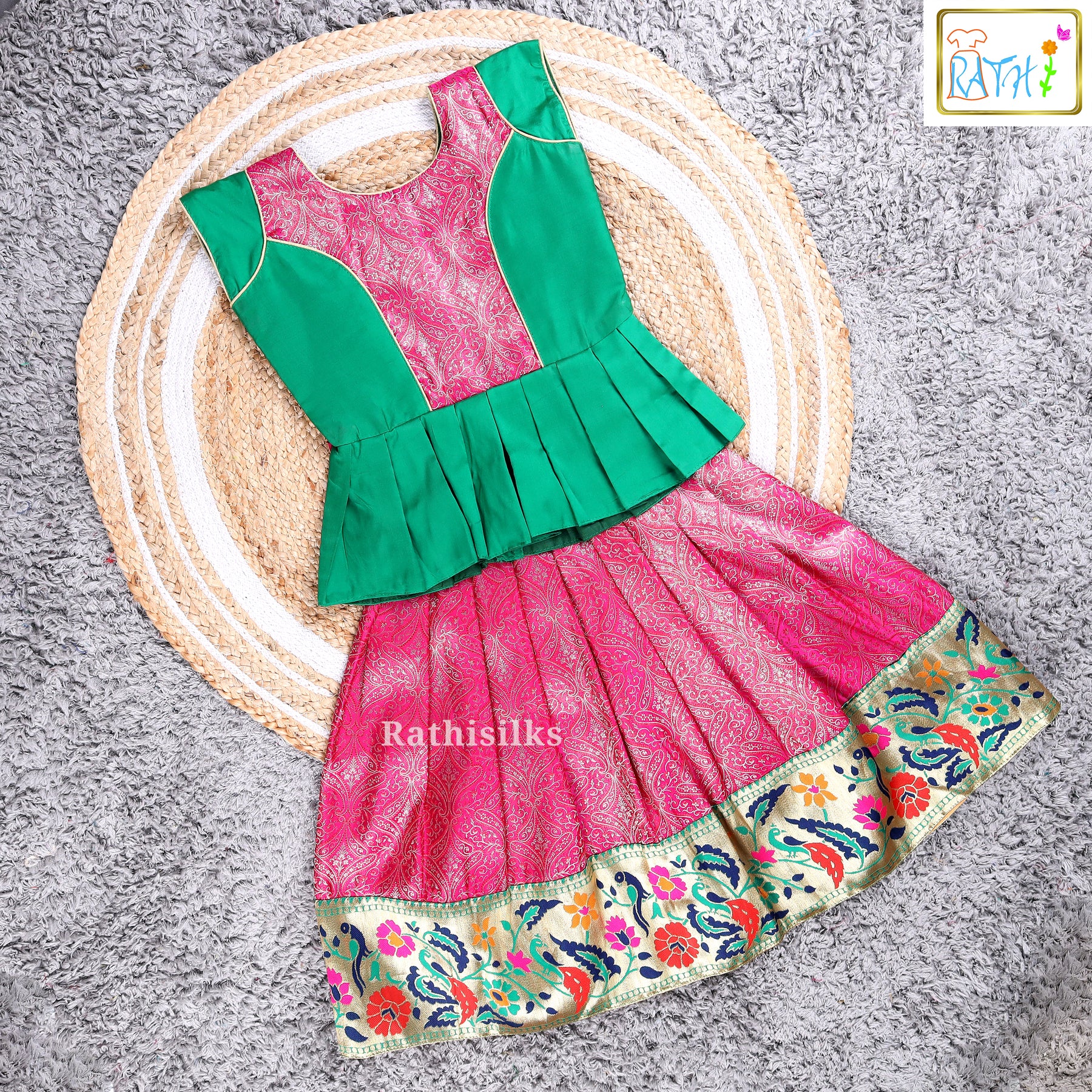 This Elegant Art Silk Pavadai Set beautifully blends vibrant colors with traditional charm. The outfit features a stylish green peplum-style blouse paired with a rich pink pavadai adorned with intricate woven motifs. The blouse is thoughtfully designed with patterned panels and subtle piping, adding a touch of elegance to the modern silhouette.