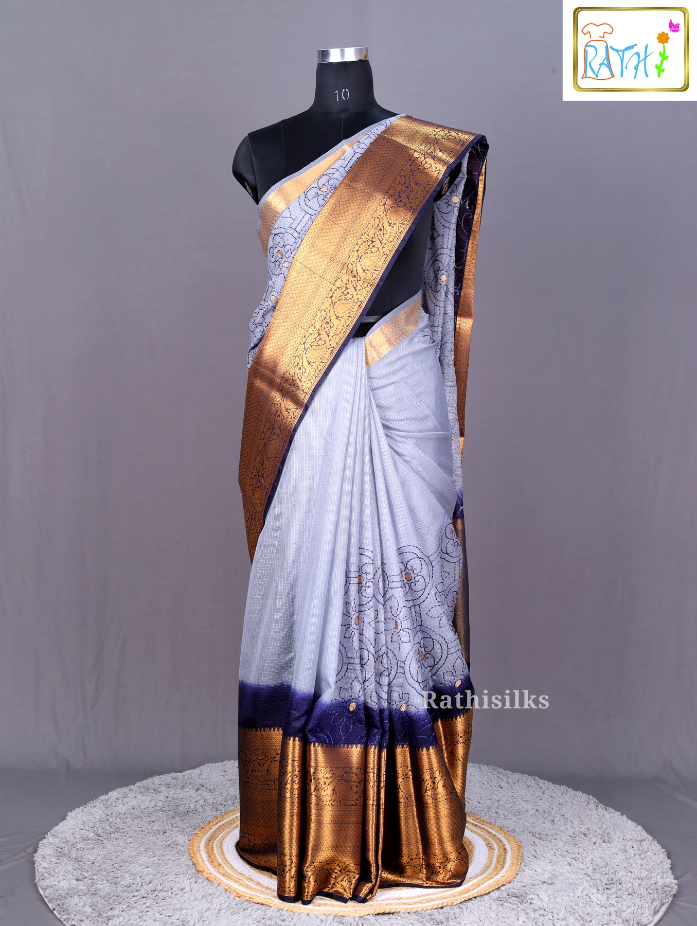 · Color Scheme : Soft grey body with a navy blue gradient and golden brocade border.