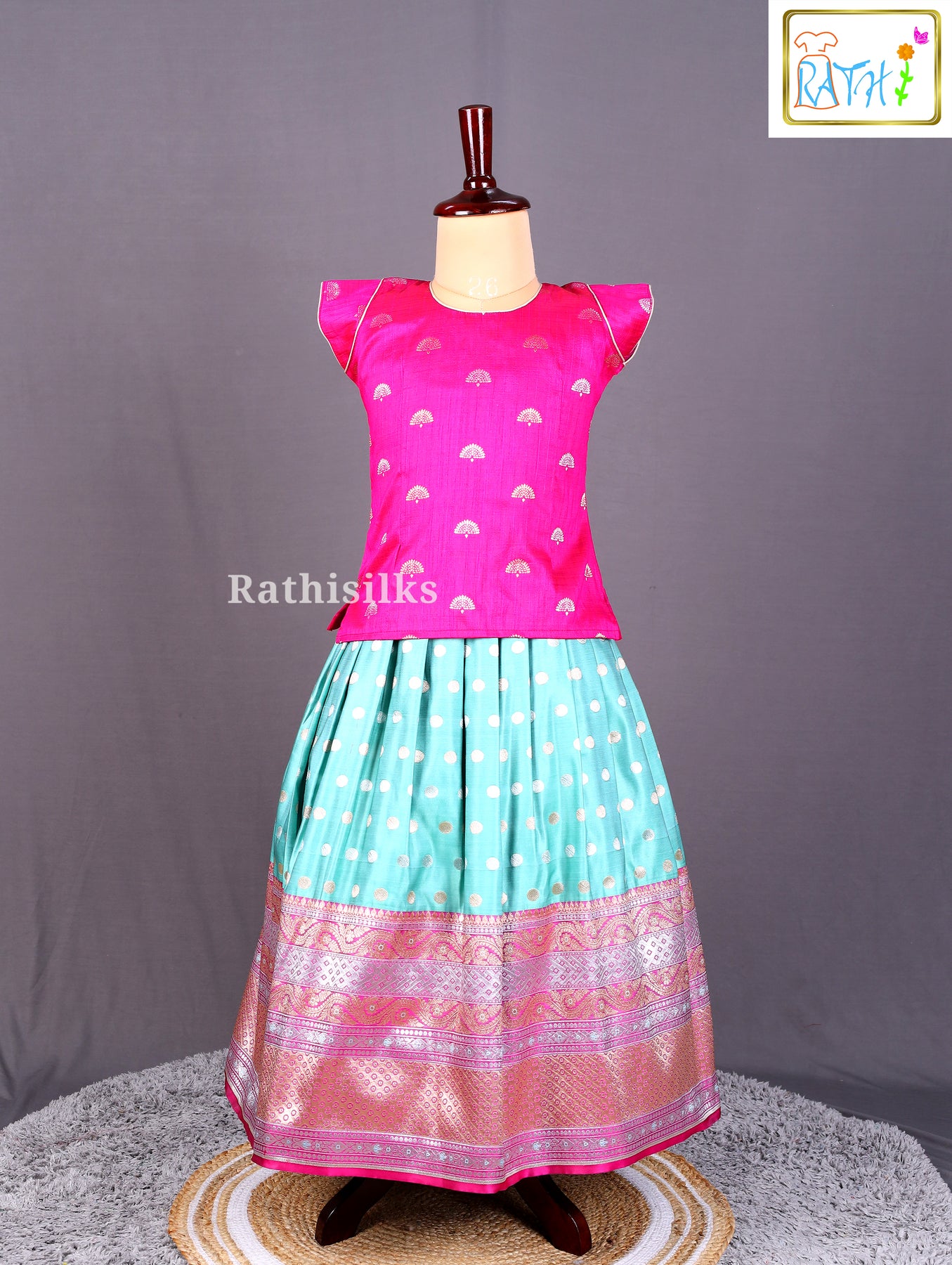 · Pavadai Pattern : Aqua skirt with golden polka zari design & pink–silver zari border