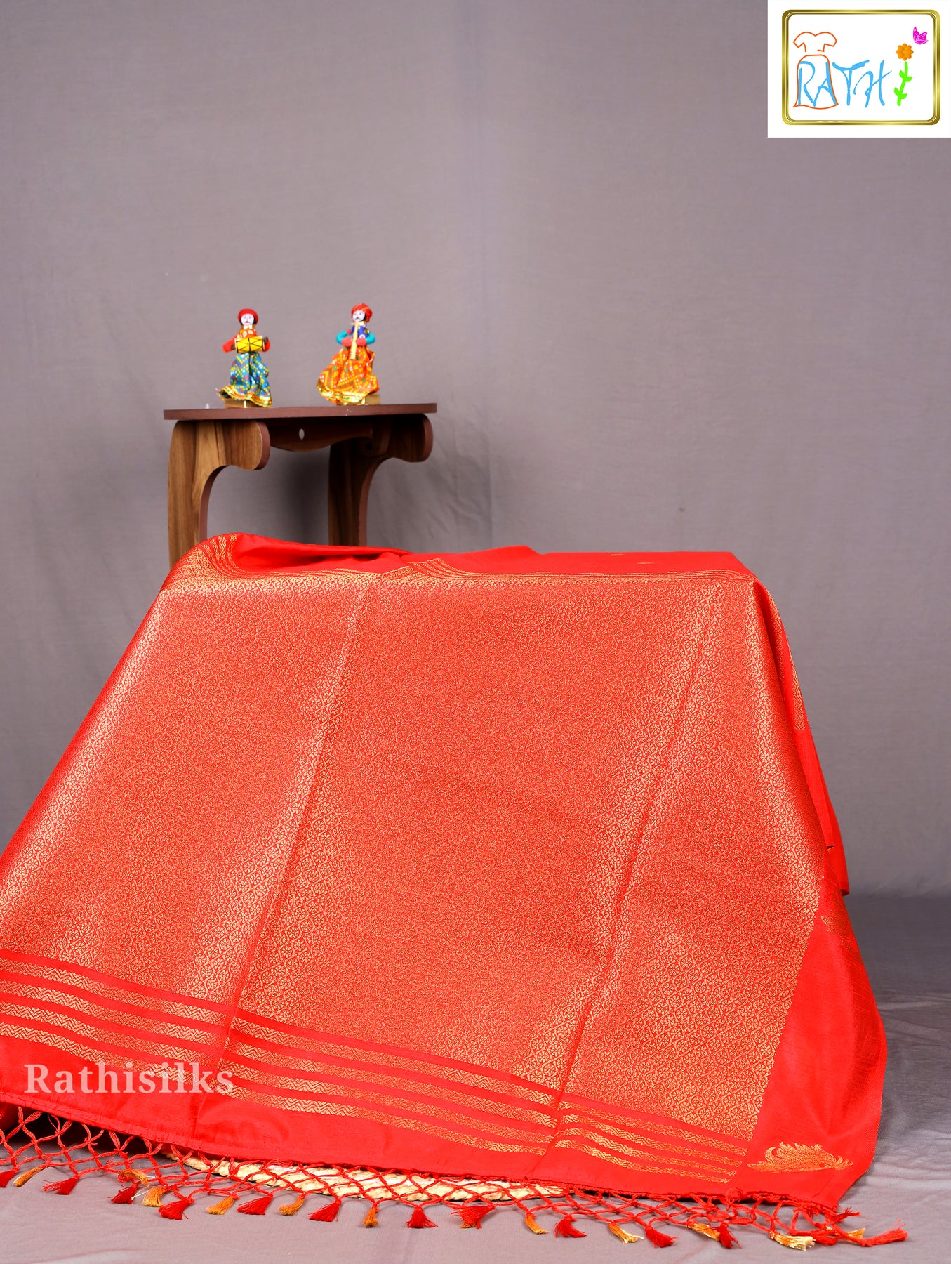 Elevate your ethnic elegance with this stunning red art silk saree, adorned with delicately woven golden motifs that enhance its rich traditional appeal. The saree features intricate zari detailing along the border and pallu, adding a regal touch to its vibrant base. Designed to offer a graceful drape and a timeless festive charm, this saree is perfect for traditional celebrations, cultural ceremonies, and special occasions. Its luminous finish and refined craftsmanship make it a standout addition to your wardrobe.