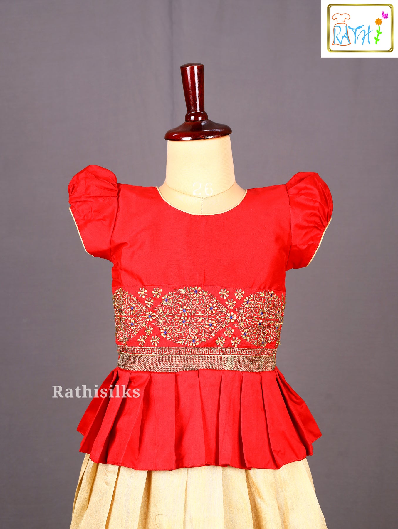 Add a regal charm to your little girl’s festive wardrobe with this stunning red and cream Karishma top and pavadai set. The red peplum-style top features intricate golden embroidery with zari and thread detailing across the waistline, adding a touch of elegance and richness. The cream-colored pleated pavadai perfectly complements the top and is finished with a matching embroidered red border for a coordinated traditional look. Crafted from smooth and comfortable fabric, this outfit ensures both style and ease of wear, making it an ideal choice for festive occasions, weddings, and cultural celebrations.