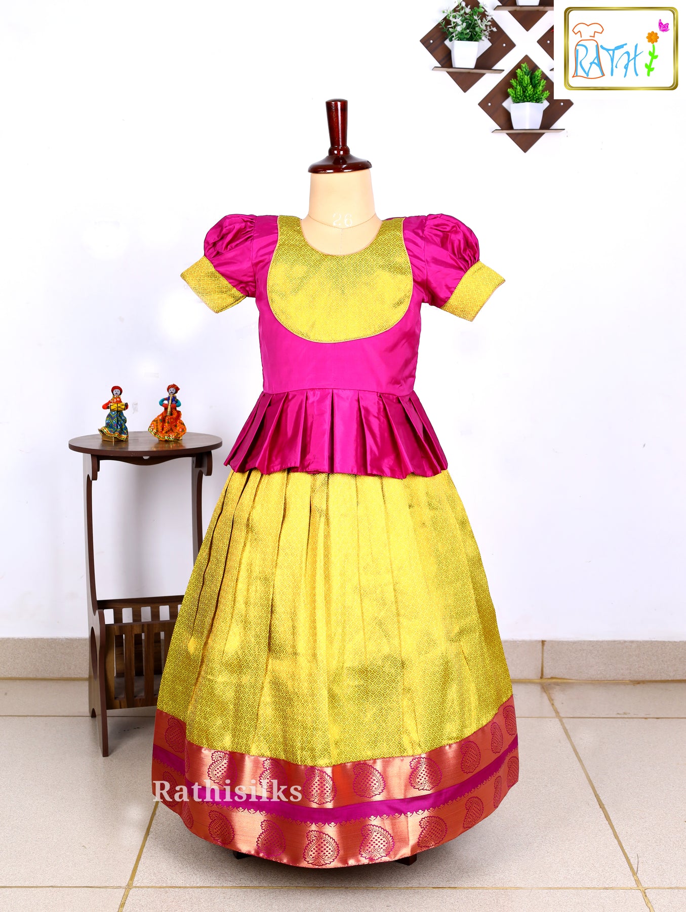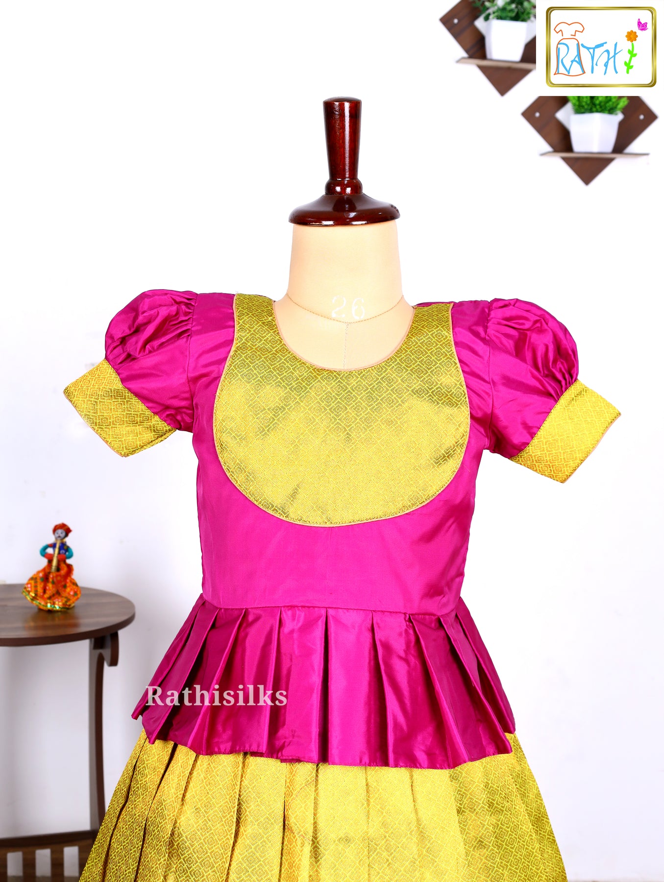 Add a vibrant traditional touch to your little girl’s festive wardrobe with this elegant Karishma Top & Art Silk Pavadai Set. The beautifully stitched pink Karishma-style top features classic puff sleeves and a contrasting golden yoke, giving it a rich ethnic look.