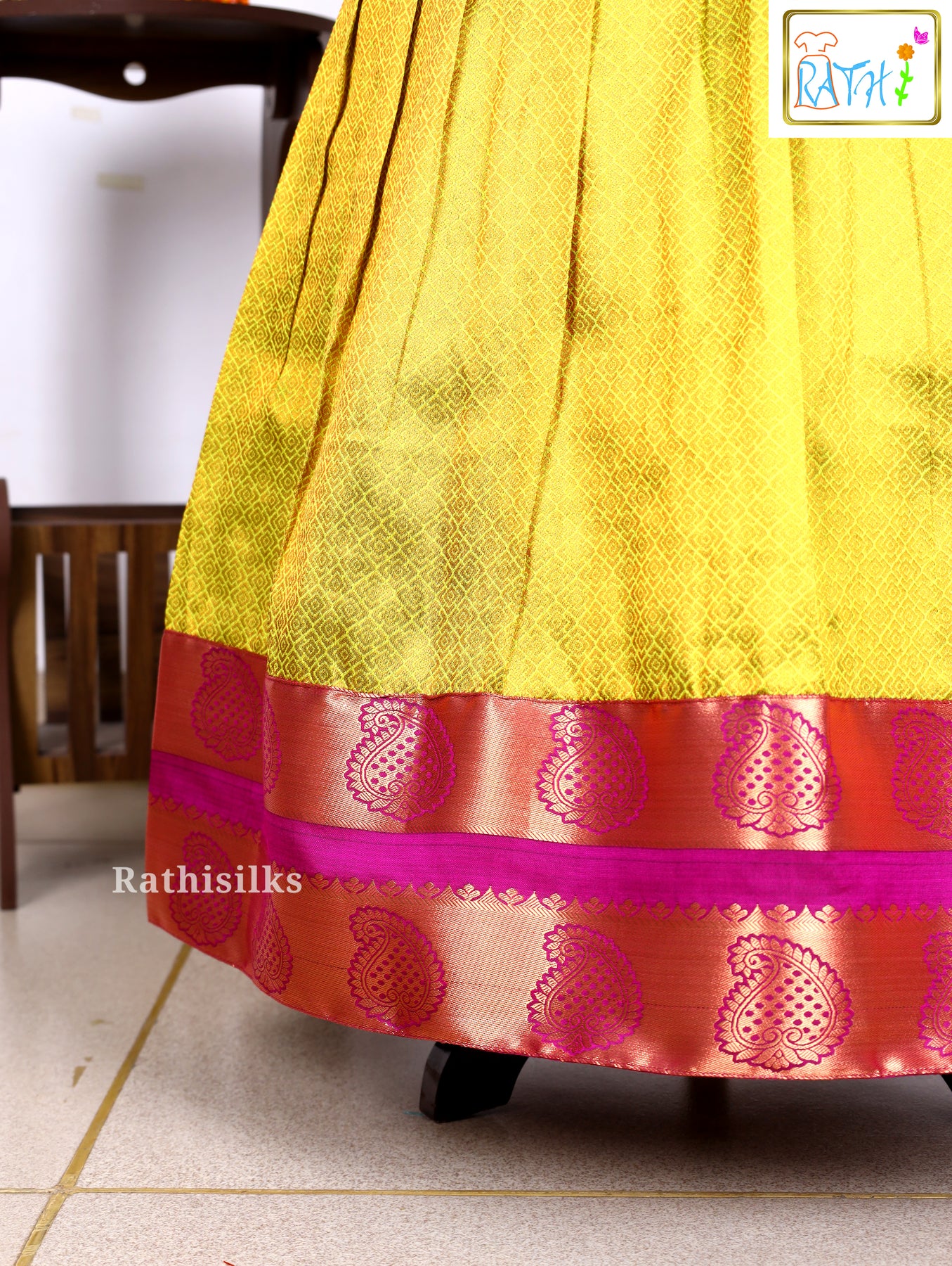 - Pavadai Color : Yellow with Pink Zari Border